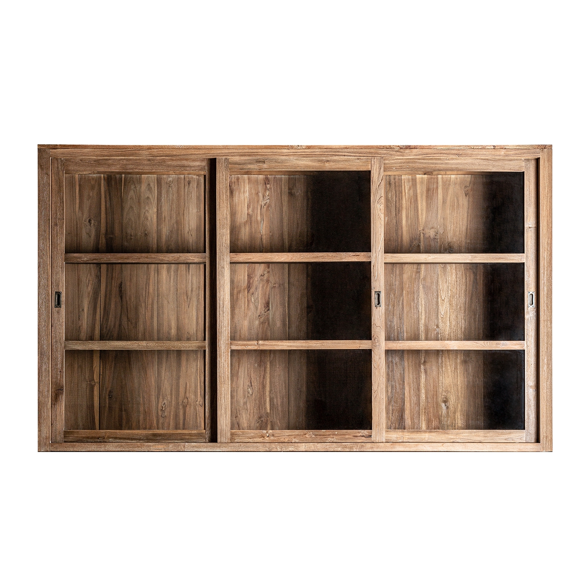 Стеклянный шкаф Nysted, натуральный цвет, колониальный стиль. Изготовлен из железнодорожной древесины. Ширина: 240 см, Глубина: 48 см, Высота: 143 см.