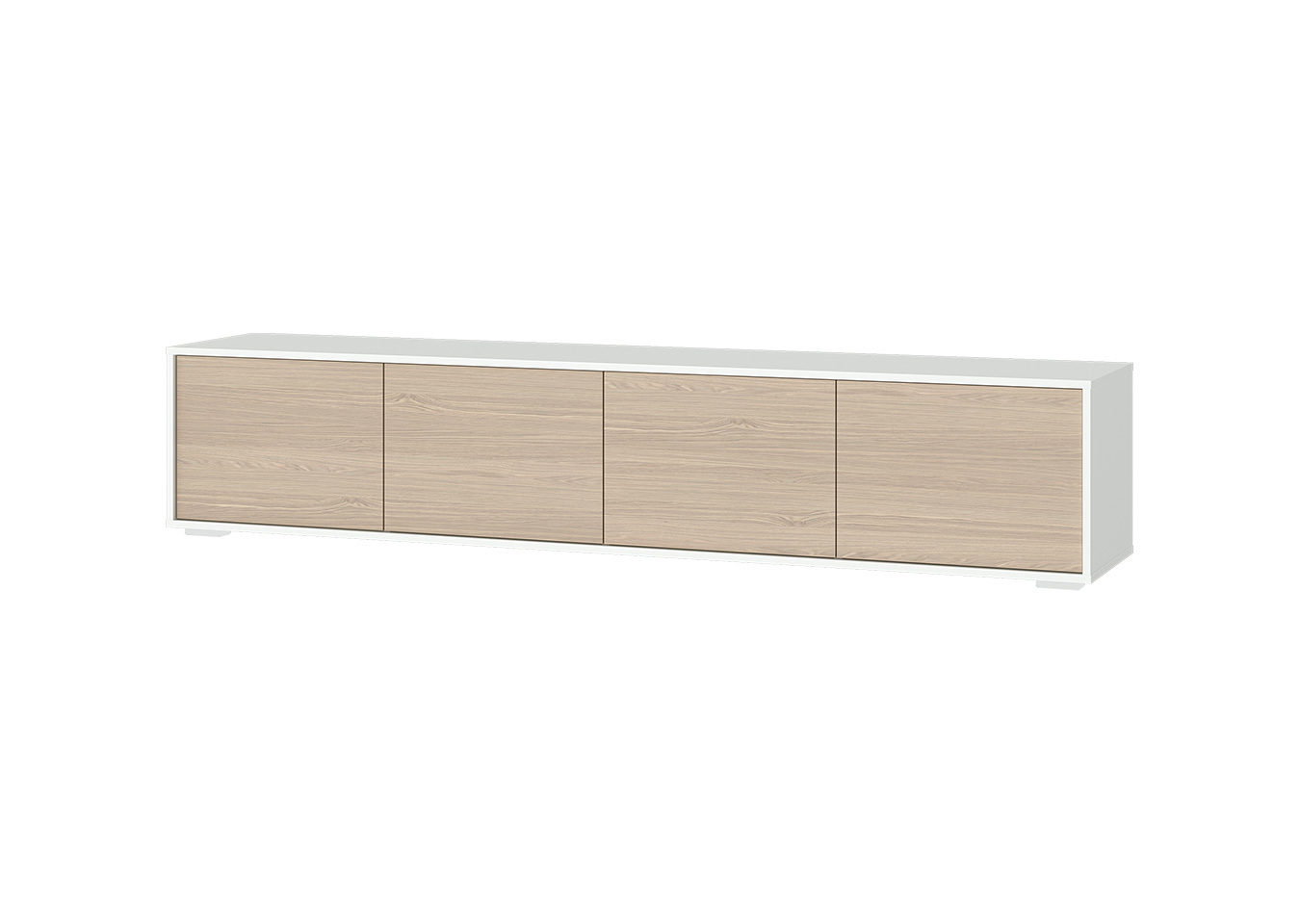 Тумба Hub 4 двери напольная на низких ножках (белый, натуральный) Высота: 41,8 см Ширина: 206,4 см Глубина: 40,5 см Корпус: ЛДСП Фасады: шпон дуба Ножки: бук