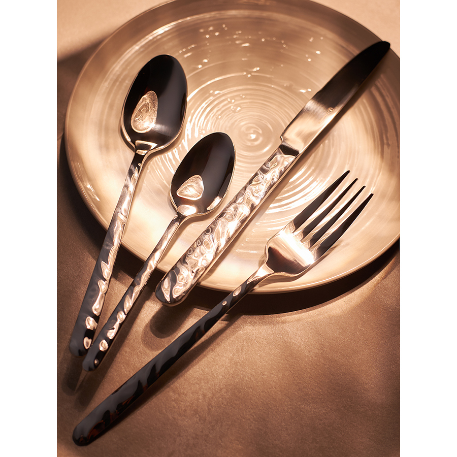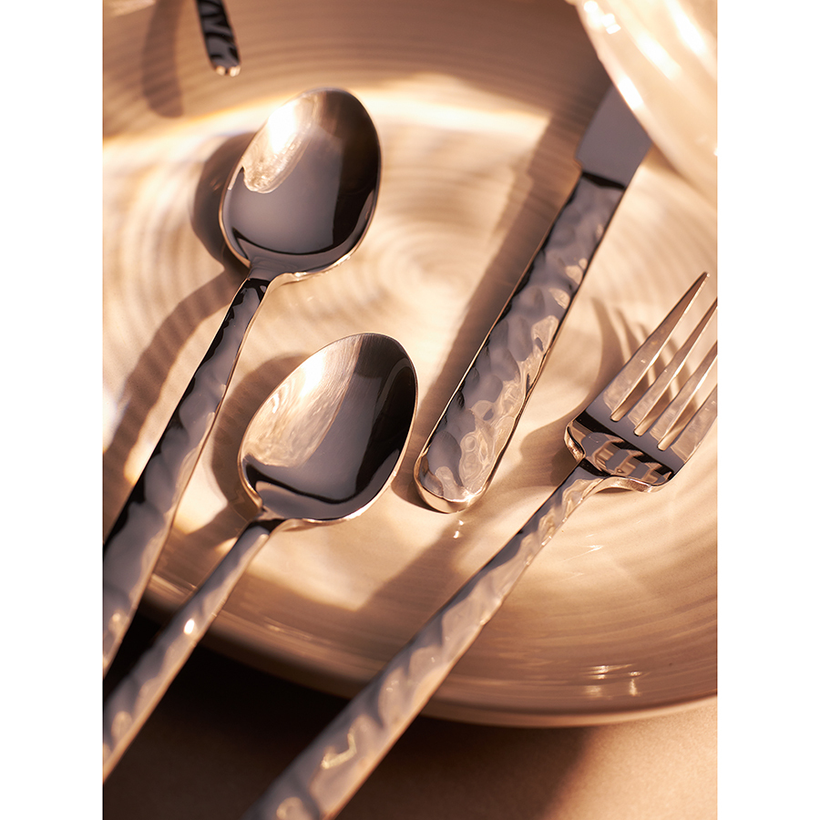 Столовые приборы Fluid – великолепное сочетание элегантного дизайна и функциональности. Сияние зеркальной полировки и плавные, обтекаемые формы делают их настоящим украшением стола. Набор состоит из 16 предметов и включает все необходимое для обслуживания 4-х человек. Особенности и преимущества: - Сталь 18/0 отличается высокой стойкостью к коррозии и износу, что гарантирует изделиям из нее практичность и долговечность. - Лезвия ножей из нержавеющей стали 13/0 устойчивы к механическим повреждениям и деформации, долго остаются острыми. - Зеркальная полировка не только придает блеск, но и облегчает уход за приборами, позволяя легко удалять с их поверхности пятна и отпечатки пальцев. - Ручки, украшенные объемным узором, делают дизайн оригинальным и обеспечивают приятные тактильные ощущения. Материалы: нержавеющая сталь: 430 (18/0), нержавеющая сталь 13/0. Размеры: Нож: длина – 23,7 см; ширина – 1,9 см; толщина – 7 мм; вес – 108,3 г. Вилка: длина – 20,2 см; ширина – 2,6 см; толщина – 3 мм. Ложка: длина – 20 см; ширина – 3,7 см; толщина – 4 мм. Чайная ложка: длина – 16,5 см; ширина – 3,4 см; толщина – 3 мм. Цвет: серебристый. Количество предметов в наборе: 16 шт. Приборы можно мыть в посудомоечной машине. Не использовать в микроволновке и на открытом огне.