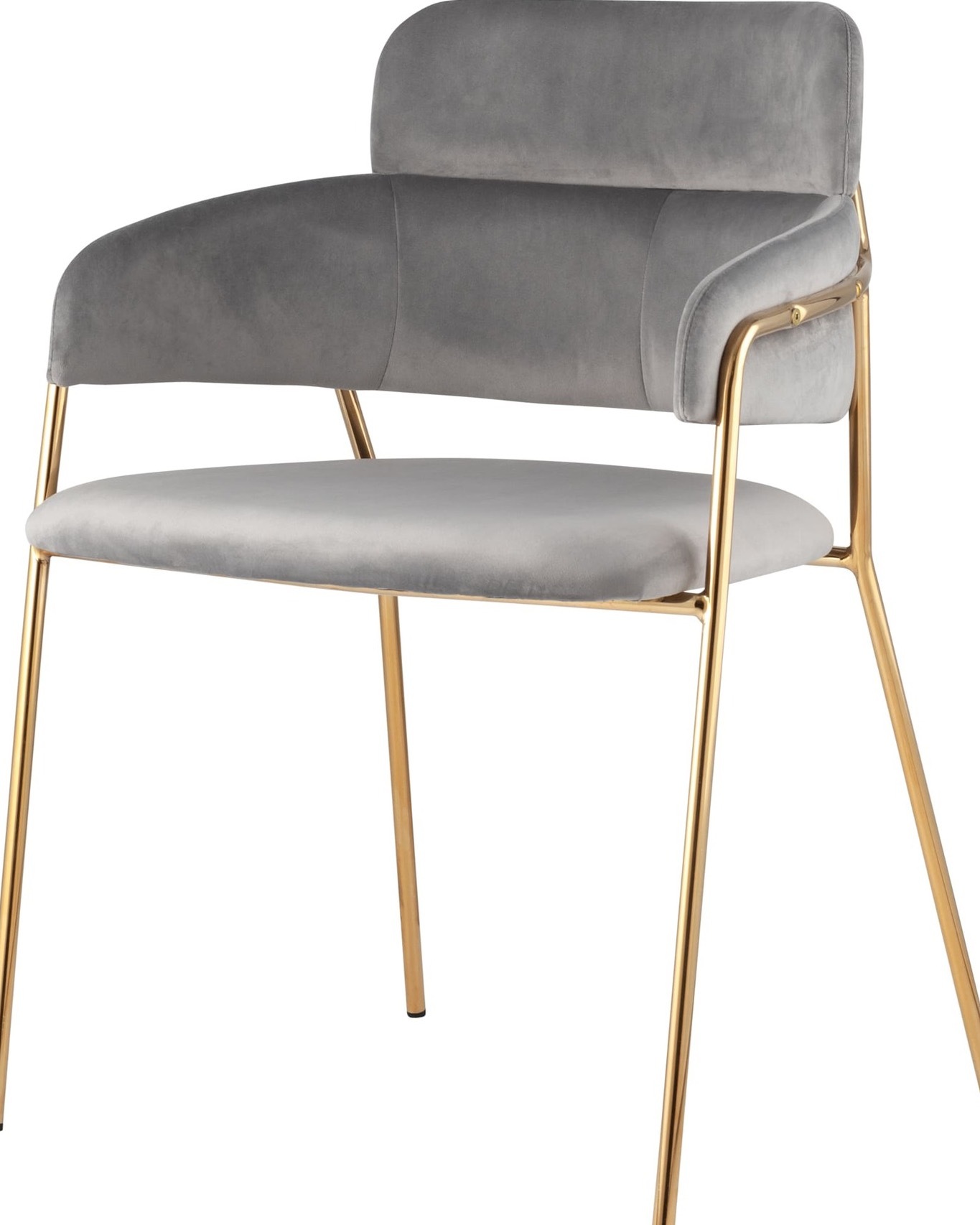 Стильный стул с оригинальной формой спинки, высокой поддержкой и подлокотниками. В качестве обивки используется мягкий велюр. Металлический каркас золотого цвета огибает спинку и выступает аккуратным акцентом модели. Широкое сиденье обеспечивает удобную посадку и уют.