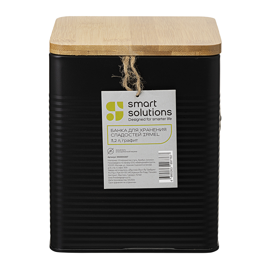 Банка для хранения сладостей Irmel от бренда Smart Solutions станет прекрасным дополнением современного кухонного интерьера. Ее дизайн органично вписывается в различные стилевые решения: минимализм, лофт, фьюжн, эклектика, афро, сканди и другие. Особенности и преимущества: - Использование в изготовлении углеродистой стали увеличенной толщины гарантирует емкости отличные эксплуатационные характеристики – устойчивость к повреждениям, износу и простой уход. - Порошковое покрытие защищает металлическую поверхность от коррозии и обеспечивает изделию дополнительную прочность. - Крышка из бамбука имеет увеличенную толщину и силиконовый уплотнитель, благодаря чему плотно прилегает, исключая попадание внутрь банки пыли и влаги. Материалы: углеродистая сталь, бамбук, силикон. Размеры: 14x14x17,2 см. Объем: 3,2 л. Цвет: графит. Загрязнения рекомендуется удалять при помощи мягкого влажного материала. После очищения банку необходимо вытереть насухо. Запрещается мытье в посудомоечной машине, использование абразивов и агрессивной бытовой химии.