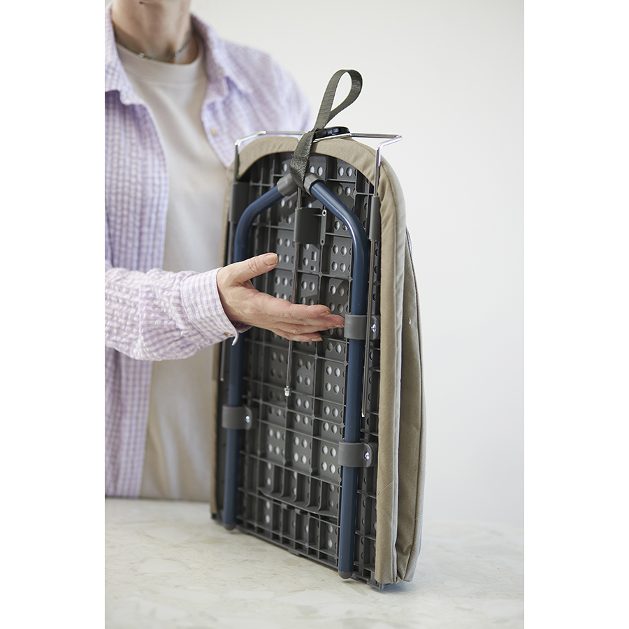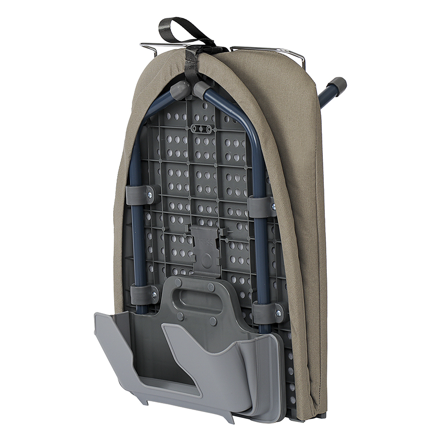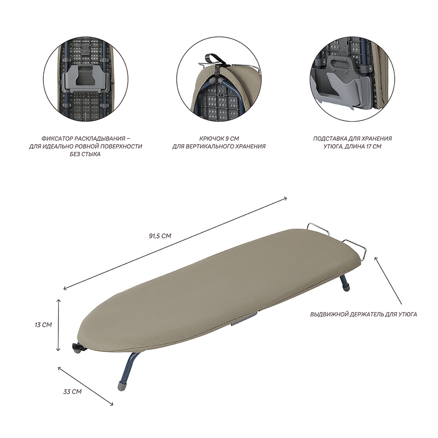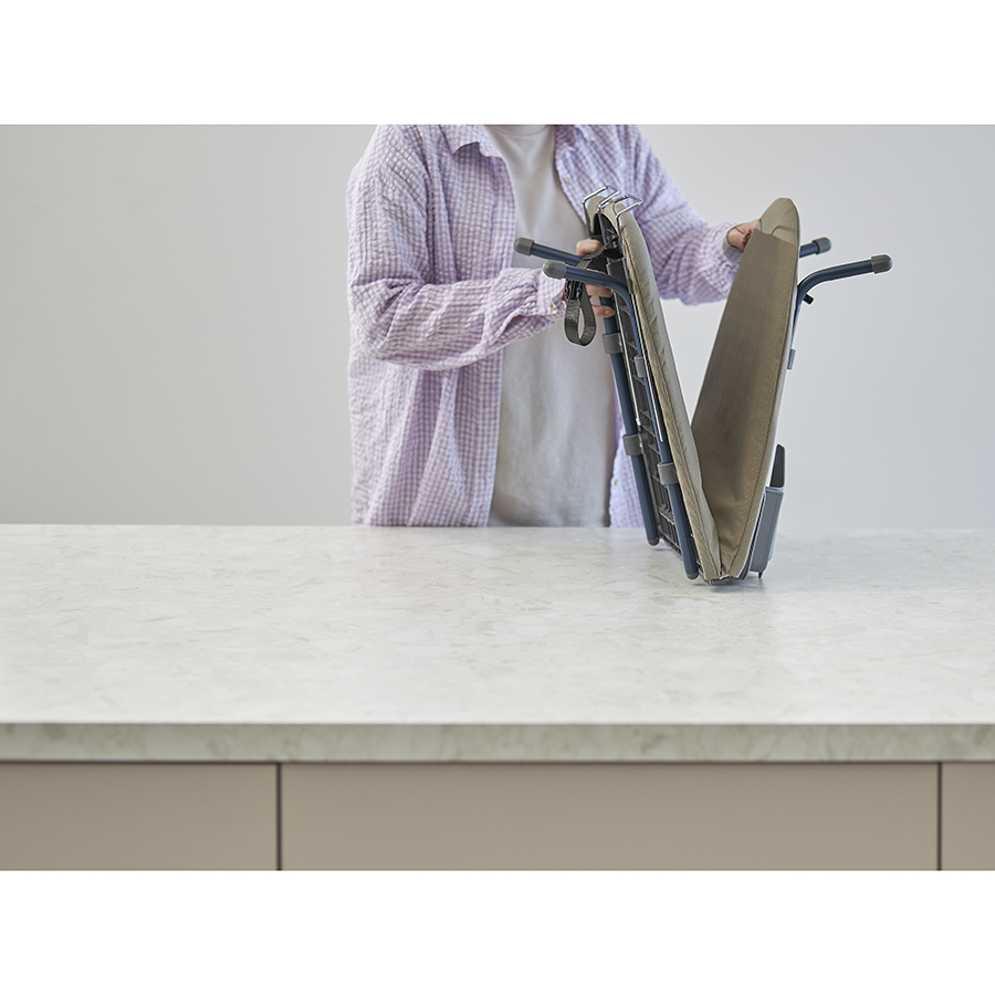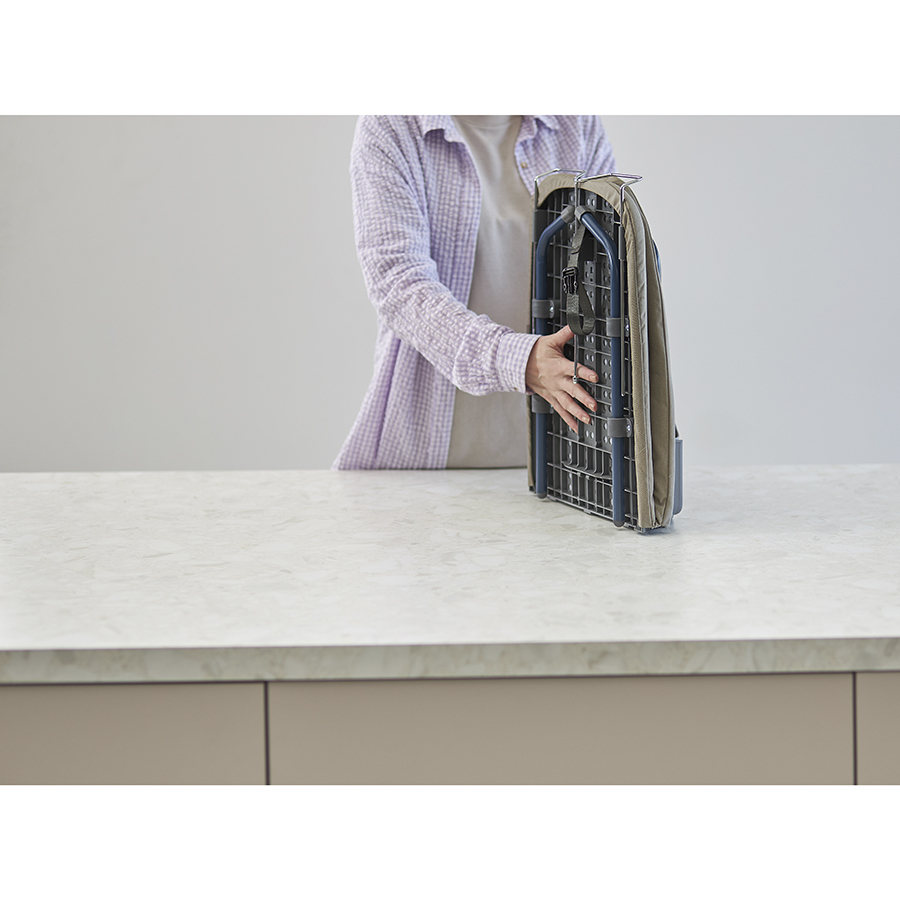 Smart Iron – практичная и удобная в использовании гладильная доска со складной конструкцией, которая подходит для любой твердой поверхности. Компактность, мобильность и современный дизайн делают ее идеальным решением для небольших пространств, студий, съемного жилья и путешествий. Особенности и преимущества: - Доску можно устанавливать на любую твердую поверхность и надежно закреплять в разложенном состоянии с помощью специального фиксатора. - Удобный механизм раскладывания обеспечивает ровную поверхность для глажки без явно выраженного стыка. - Складная конструкция и наличие специальной петли для подвешивания на стену обеспечивают ее компактное хранение даже в ограниченном пространстве. - Чехол из 100% хлопка с увеличенной плотностью 180 г/м2 (вид плетения - сатин) и 5-мм прослойкой из фетра содает оптимальной баланс мягкости и упругости, хорошо впитывает влагу и быстро сохнет. - Выдвижная металлическая подставка для утюга гарантирует удобное и безопасное использование. - Ножки с защитными пластиковыми колпачками не скользят и не царапают рабочую поверхность. - Предусмотрен специальный “карман” для хранения утюга, который при необходимости легко складывается “гармошкой”. Материалы: сталь, полипропилен, термопластик, хлопок, фетр, поролон. Размеры доски в разложенном состоянии: 33х13х91,5 см. Размеры доски в сложенном состоянии: 33х12х46 см. Размер гладильной поверхности: 91,5х33 см. Длина подставки для утюга: 17 см. Длина крючка: 9 см. Рекомендована сухая чистка чехла.