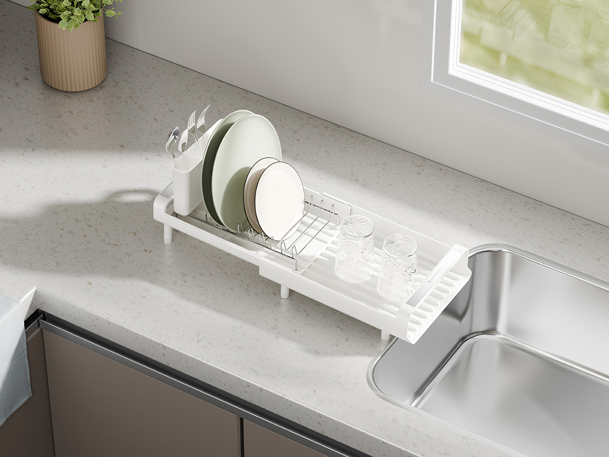 Сушилка Atle – компактная, но в то же время вместительная модель с раздвижной конструкцией, в которой предусмотрены отделения для посуды и кухонных принадлежностей. Удобное размещение и надежную фиксацию тарелок и других емкостей обеспечивают железные разделители. Поддон выполнен из практичного полипропилена, который легко моется. Стальные элементы на корпусе имеют специальное покрытие против отпечатков пальцев. Настольную сушилку можно размещать в любом месте и для ее установки не требуется делать отверстия в стене. Материалы: полипропилен, сталь, железо. Размеры в сложенном виде: 20х28х12,5 см. Размеры в разложенном виде: 20х47х12,5 см. Цвет: белый. Сушилку можно очищать от загрязнений в теплой мыльной воде с помощью мягкой губки. Запрещается использование агрессивной бытовой химии и абразивных материалов.