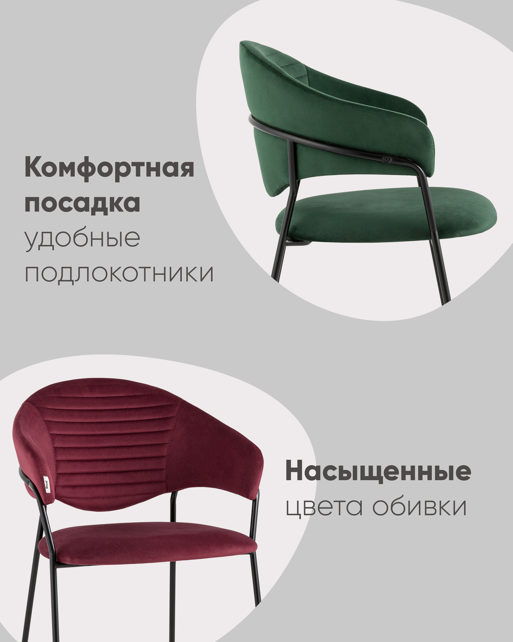 Стильный кухонный стул с оригинальной формой спинки, высокой поддержкой и подлокотниками. В качестве обивки используется мягкий велюр – приятный на ощупь износостойкий, гигроскопичный материал. Металлический каркас в черном цвете огибает спинку и выступает аккуратным акцентом модели. Широкое сиденье обеспечивает удобную посадку и уют.