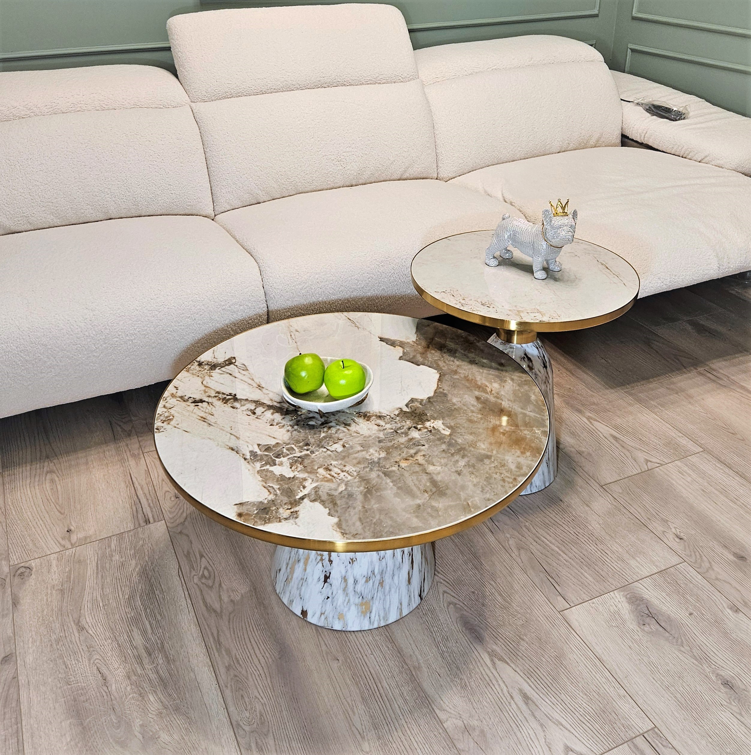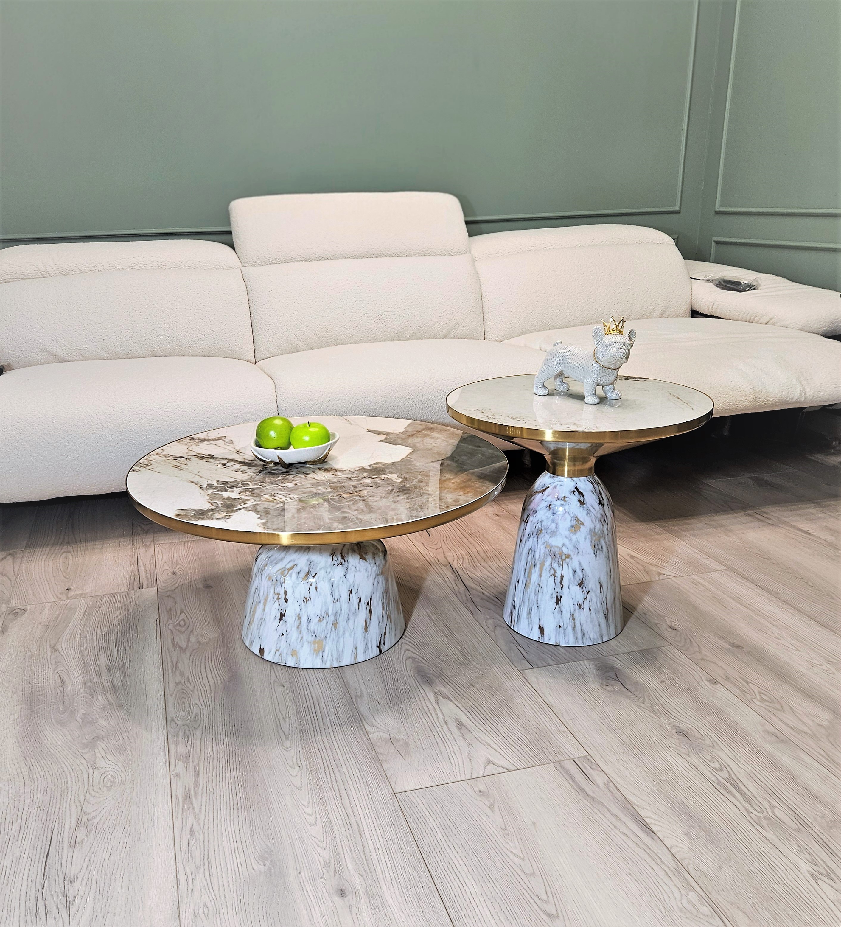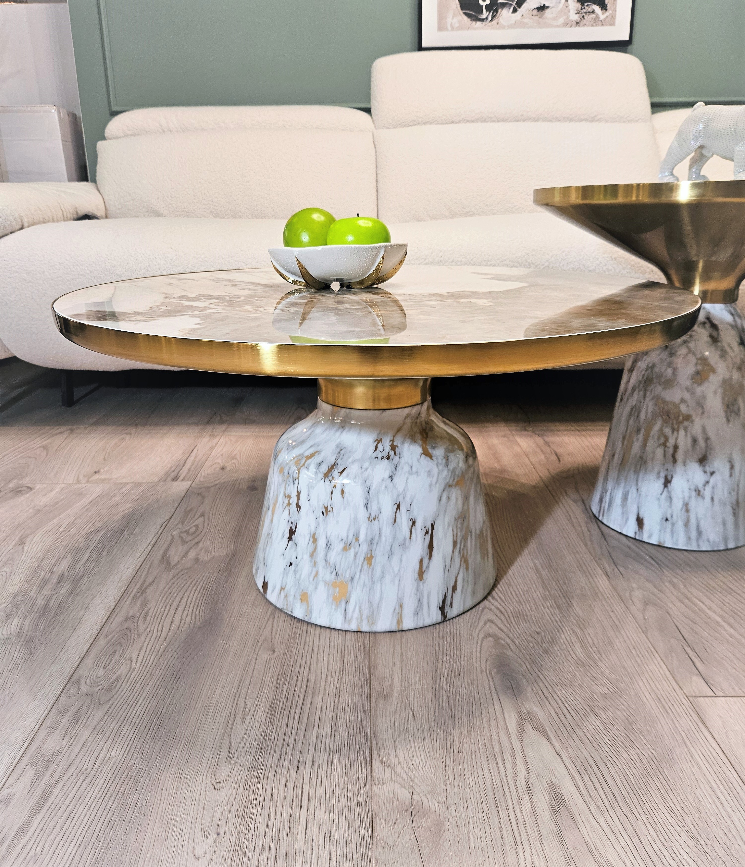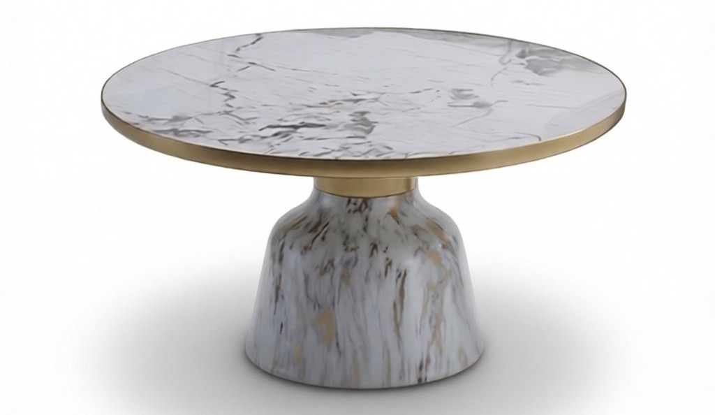 Столики представлены в 2-х размерах:1) диаметр 75 см, высота 40 см;2) диаметр 50 см, высота 51 см. Столешница из керамогранита с глянцевой поверхностью.Нижняя часть выполнена из металла в технике золото браш.Поверхность ножки глянцевая с полимерным покрытием под мрамор.Цвет соответствует фото. Важно! Во время перемещения, переноса или наклона столика следует надежно фиксировать столешницу (удерживать), чтобы предотвратить её случайное выпадение. Поставляется в собранном виде.
