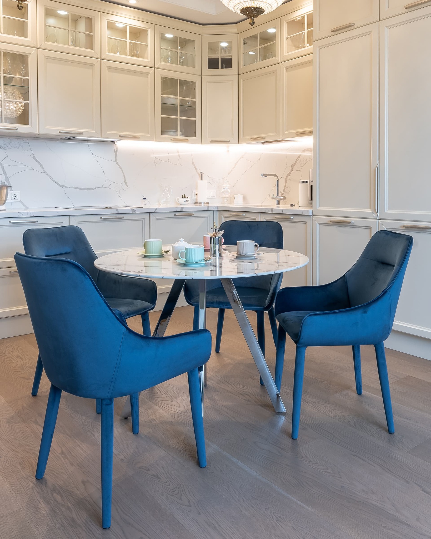 Обеденный стол с красивой стеклянной круглой столешницей белого цвета с рисунком под мрамор.