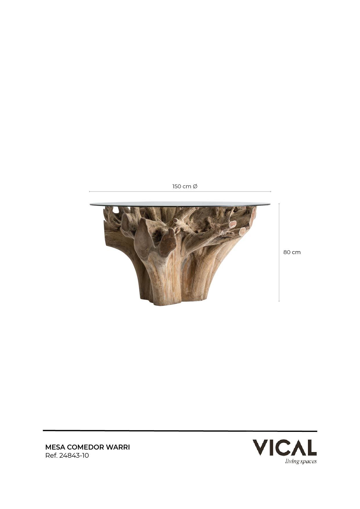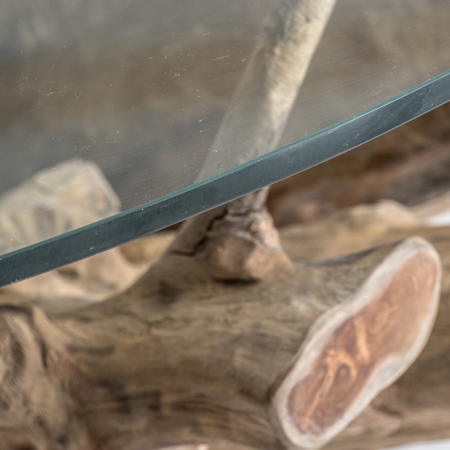 Обеденный стол Warri, натуральный цвет ручной работы, этнический стиль. Изготовлен из корня тика в сочетании со стеклом.