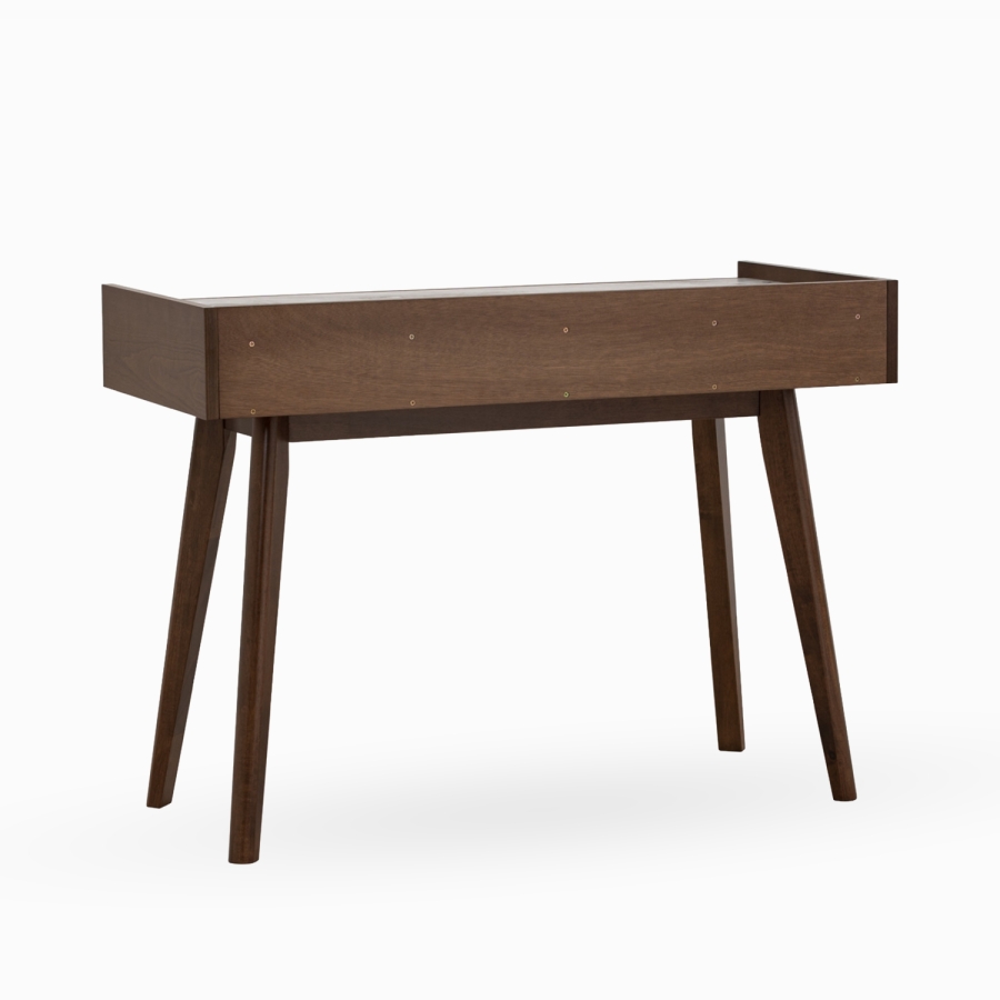 Каркас стола выполнен из МДФ, декорированного шпоном натурального ясеня в цвете какао. Теплый, глубокий коричневый оттенок с выразительной текстурой древесины создает прочную и эстетичную основу. Дополнительную устойчивость и благородство конструкции придают ножки из массива малазийского дуба, окрашенные в тот же цвет какао. Компактные размеры стола (110×50 см) позволяют разместить его даже в небольшом помещении, а увеличенная высота 78,5 см обеспечивает более эргономичную посадку для людей высокого роста или тех, кто предпочитает работать стоя. Стол Breda станет элегантным центром домашнего кабинета или уютным уголком для творчества.