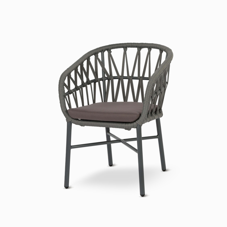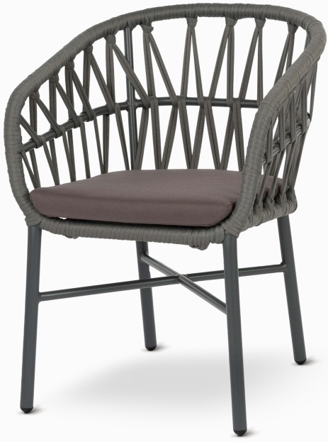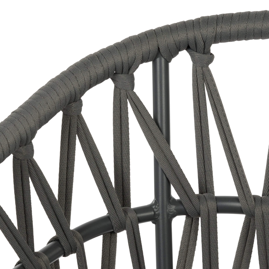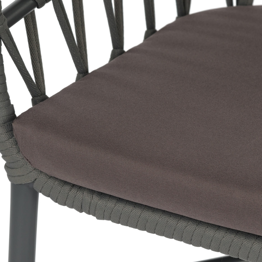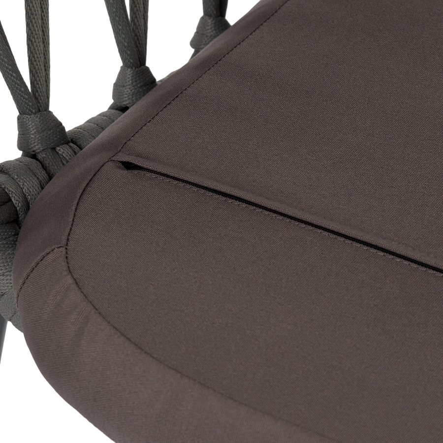Сиденье и спинка выполнены из полиэстеровой веревки, устойчивой к ультрафиолету и влаге. Дополнительно стул оснащен съемной подушкой с наполнителем из пенополиуретана, которая обеспечивает комфорт даже при длительном использовании.