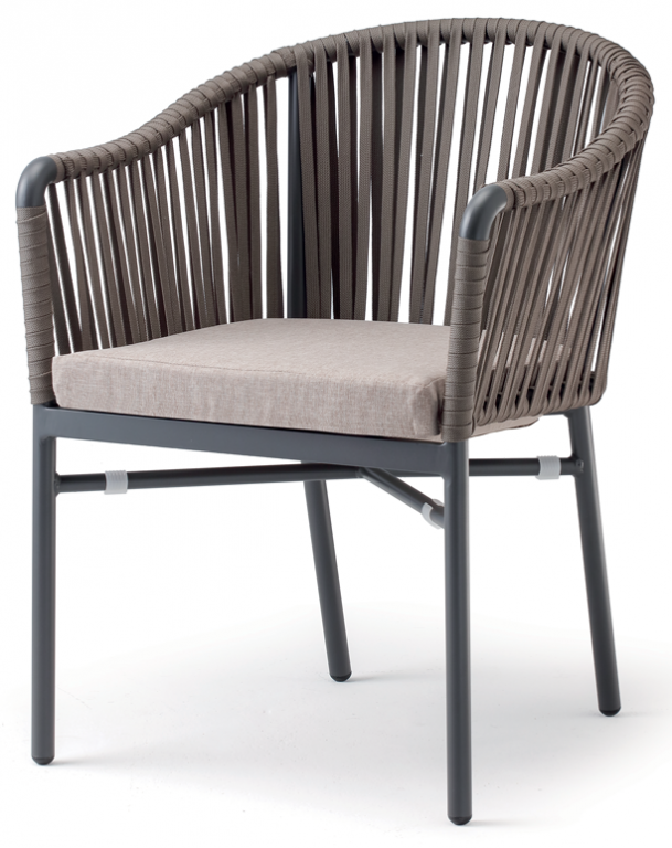 Уличное кресло Monaco с эргономичным и современным дизайном с алюминиевым каркасом и спинкой в канатном плетении, изготовленном из нитей полиэтилена (роуп), покрытых текстиленом. на сиденье подушка со съемным чехлом из олефина, защищающей от атмосферных воздействий и пятен. Если снять подушку, кресло можно штабелировать. Модель подходит для открытой террасы бара, ресторана, отеля или небольшого частного зимнего сада. Возможность штабелирования: до 10 шт.
