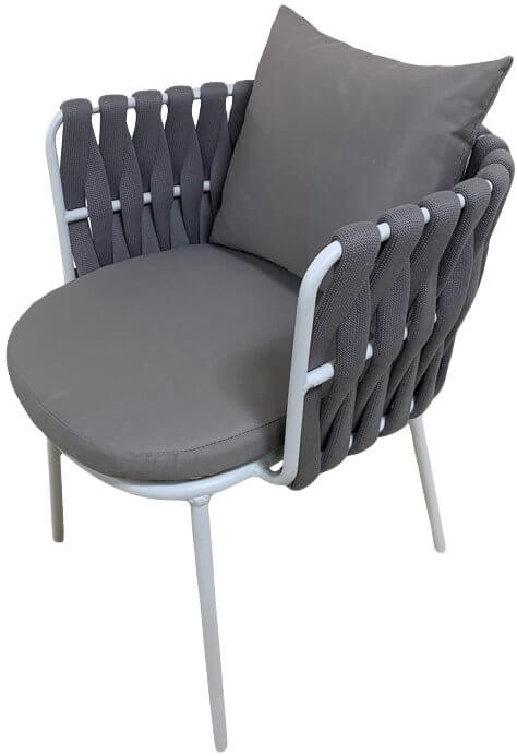 Обеденное кресло Roma привлекает внимание и, несомненно, украсит любое открытое пространство. Уличное кресло с эргономичным и современным дизайном с алюминиевым каркасом и спинкой в плетении из роупа. Модель подходит для открытой террасы бара, ресторана, отеля или небольшого частного зимнего сада. Особенности: Каркас выполнен из алюминия, который является одним из наиболее коррозионно-стойких металлов. Алюминий имеет защитное порошковое покрытие, которое предотвращает коррозию и делает этот материал подходящим для наружного применения. Цвет покрытия - белый. Спинка кресла выполнена из плетения веревки (роуп). Материал - полиэстер светло-серого цвета.Ширина - 40 мм.Как и другие синтетические материалы, роуп рассчитан на любые погодные условия, и его можно оставлять на улице круглый год. В комплект входит акриловая подушка для сиденья толщиной 40 мм. Цвет - A13806. Открыть инструкцию по уходу.