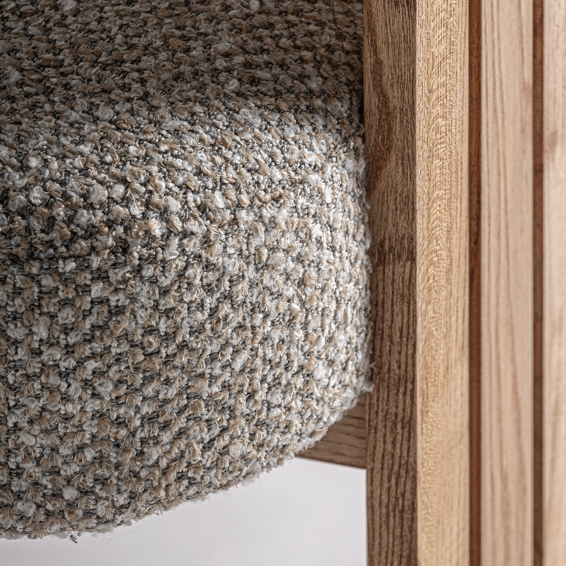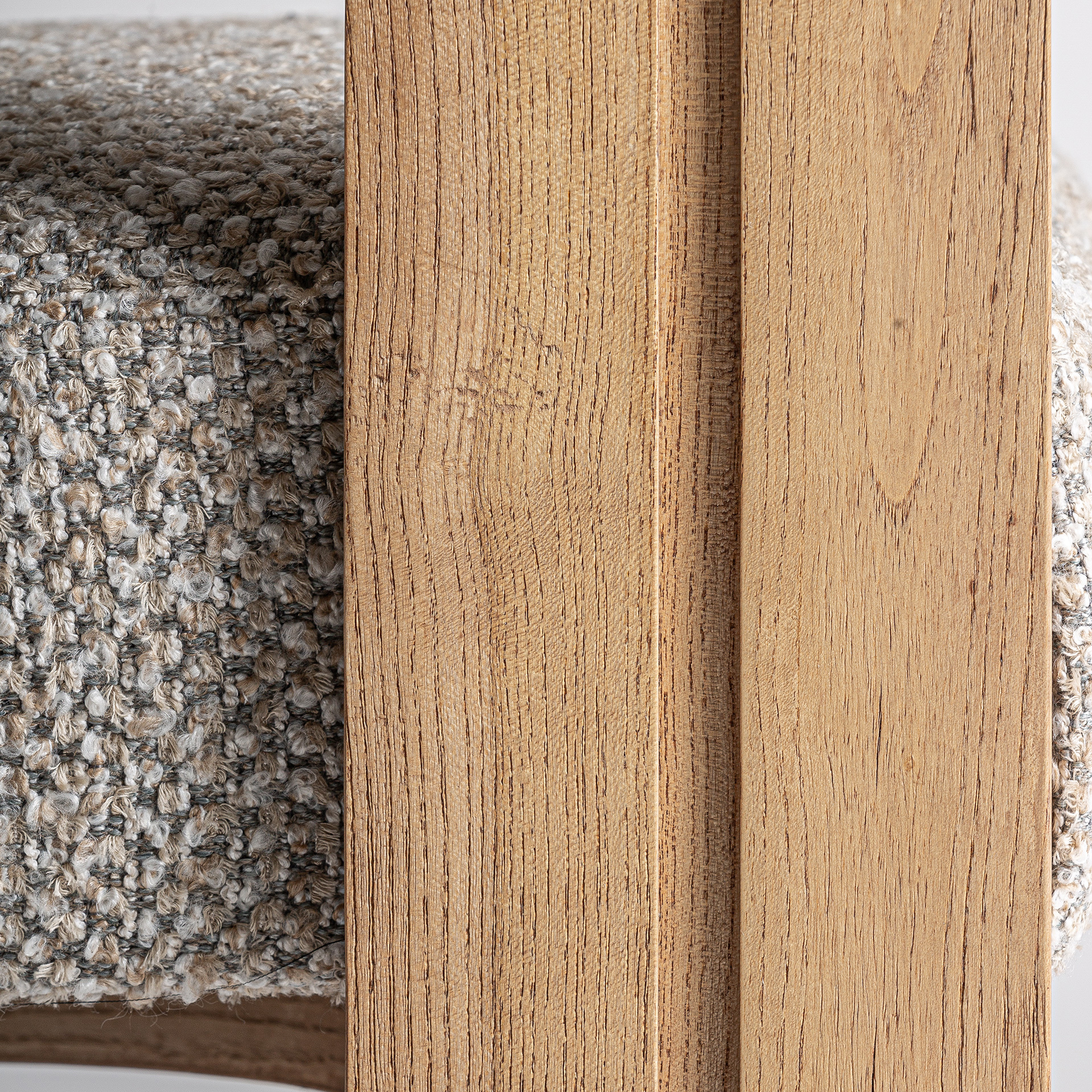 Стул изготовлен из бежевого полиэстера в сочетании со светло-коричневой древесиной дуба.