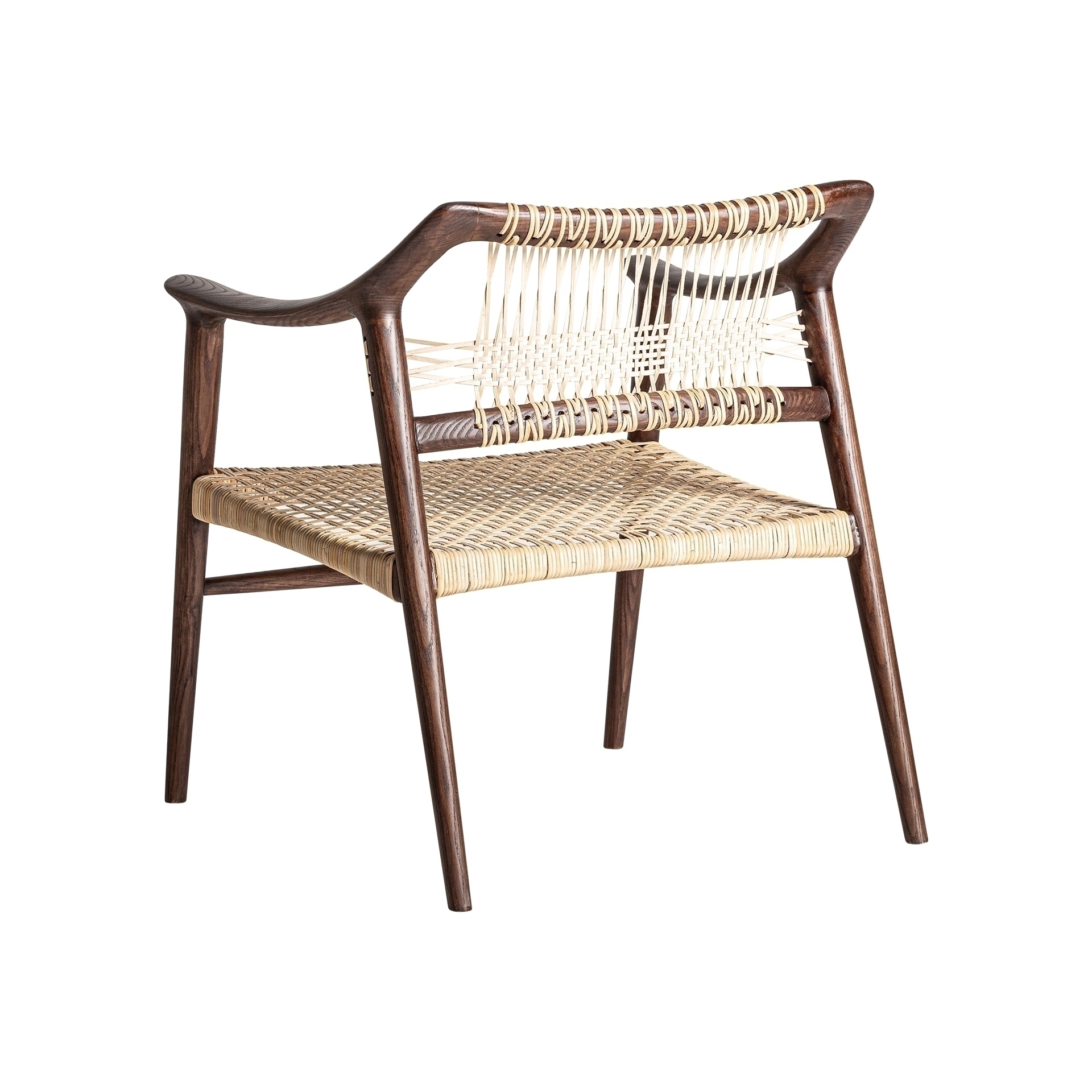 Стул, коричневый цвет, стиль бохо. Изготовлен из древесины ясеня в сочетании с ротангом.