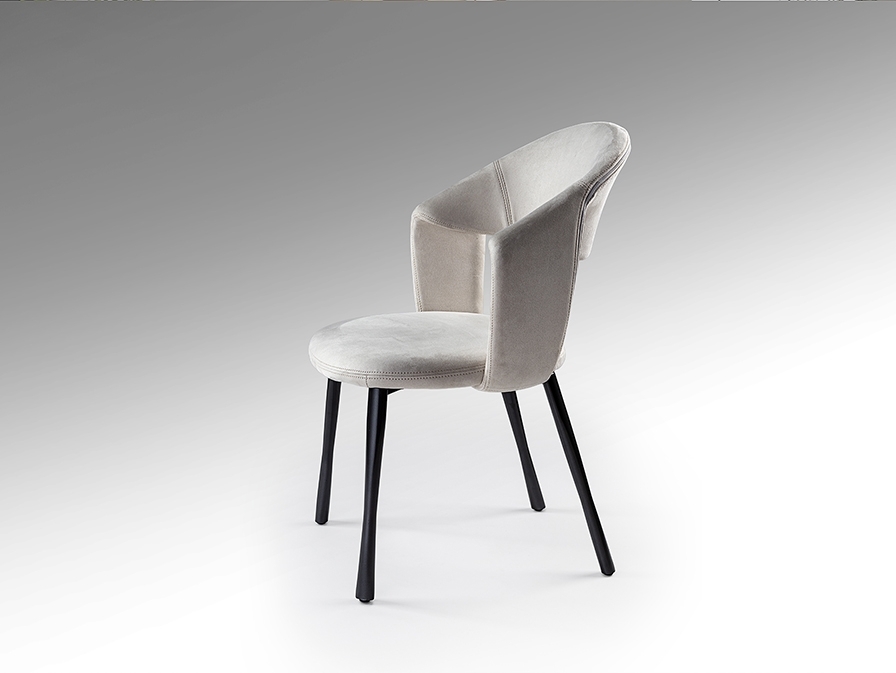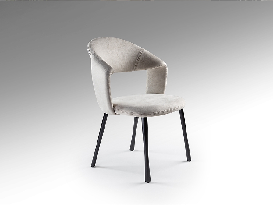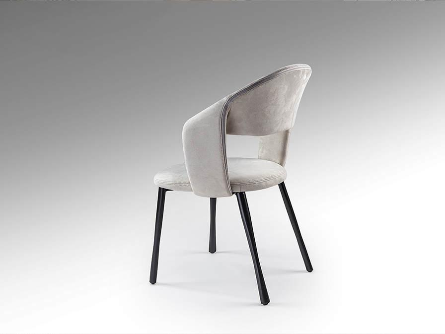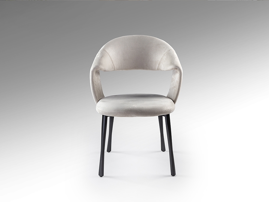 Стул из металла и изогнутой фанеры. Металлические ножки с черной отделкой и обивкой под замшу в цвете камня.