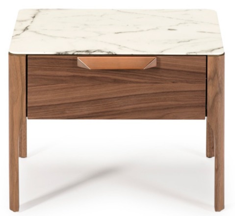 Эта прикроватная тумбочка от испанской фабрики Angel Cerda — настоящее произведение искусства для вашей спальни. Ее уникальность — в безупречном сочетании благородных материалов: прочный шпонированный орехом МДФ, изысканная столешница из серого мрамора и элегантные деревянные ножки. Каждая деталь продумана дизайнерами, чтобы создать эксклюзивный предмет интерьера. Вместительный выдвижной ящик с доводчиком обеспечивает комфортное хранение, а нестандартное расположение ножек гарантирует высокую прочность и устойчивость.