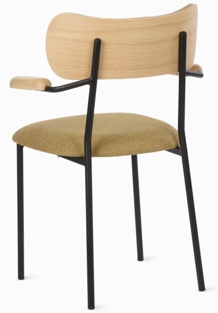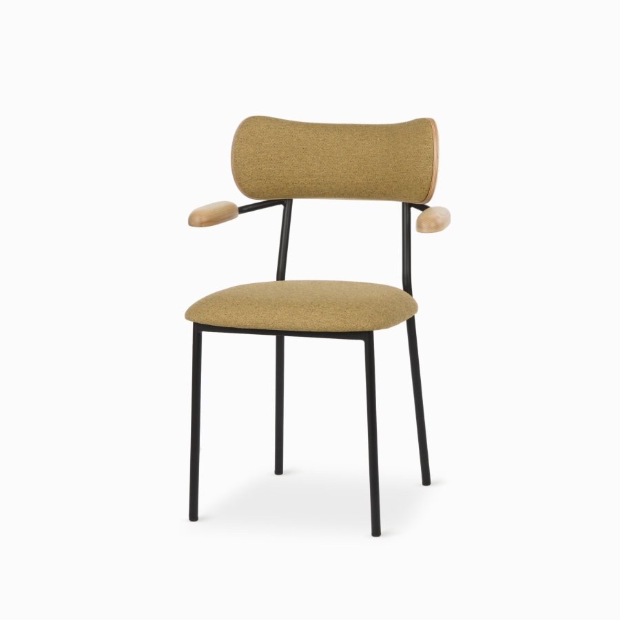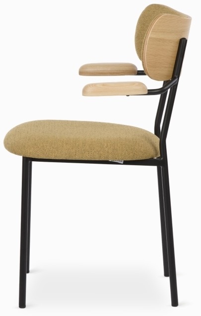 Стул Marla Arm имеет обивку из бежевой ткани, спинку из массива дуба, подлокотники из ясеня и стальной каркас с черным матовым покрытием.