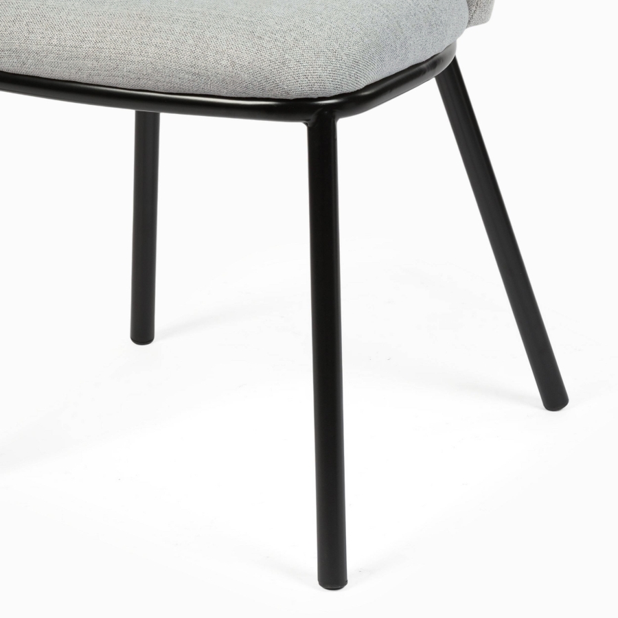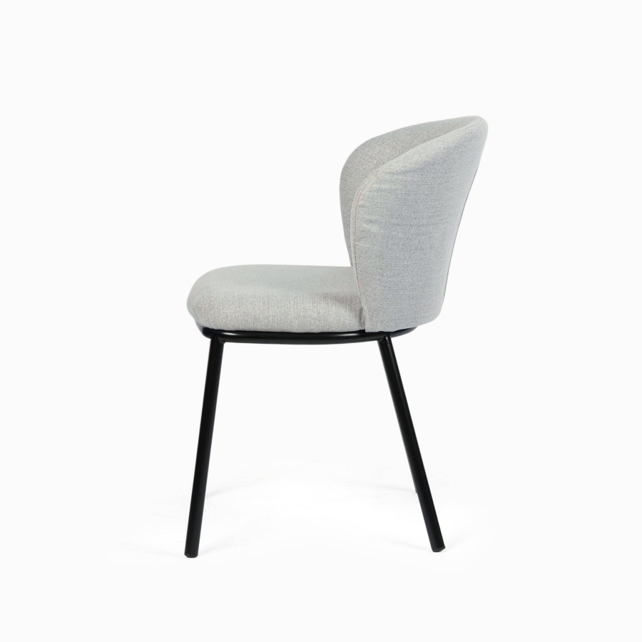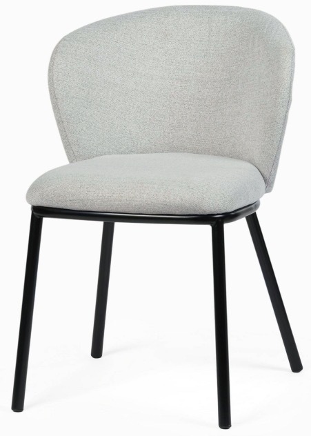 Стул Limma имеет мягкое сиденье с обивкой из светло-серой ткани и металлические ножки черного цвета.