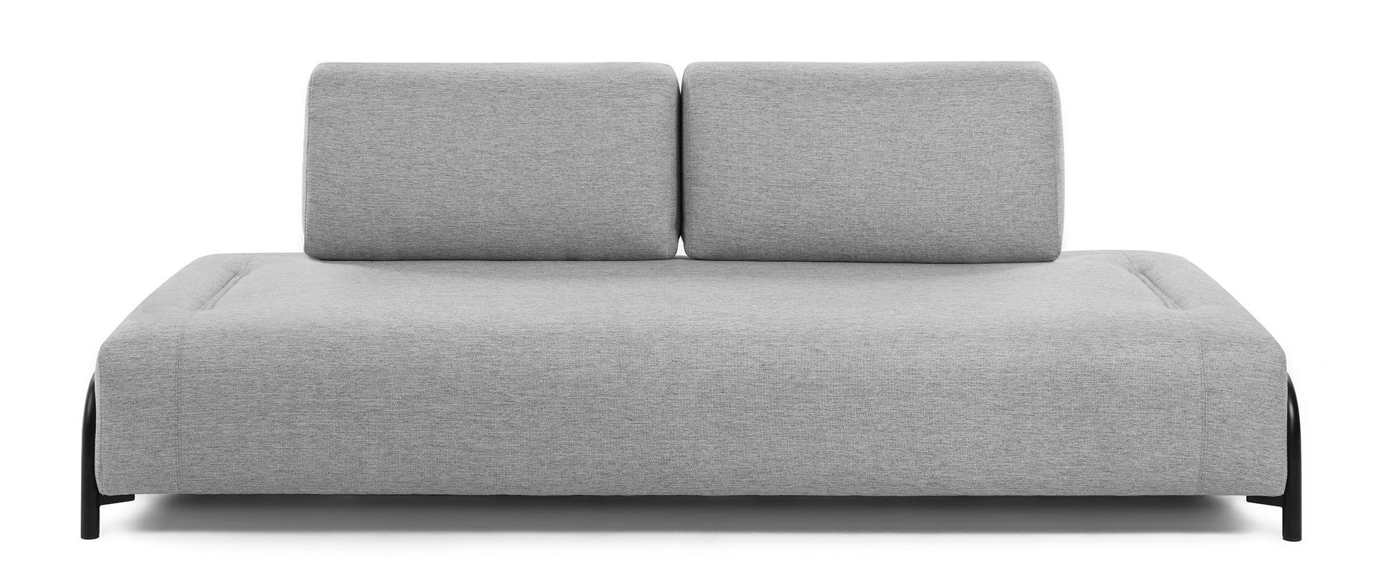Диван Compo от La Forma с возможностью замены подлокотников на подносы. Три базовых цвета обивки (голубой, светло-серый, темно-серый). Ткань — 100% полиэстер (фактура «рубчик», 310 г/м²). Каркас из ДСП сосны, МДФ, акриловых волокон. Наполнитель: спинка/подлокотники — ППУ 20 кг/м³, сиденье — ППУ 30 кг/м³. Металлические опоры (трубчатые, чёрные, с наконечниками). Чехлы на подушках съёмные. Подносы приобретаются отдельно.