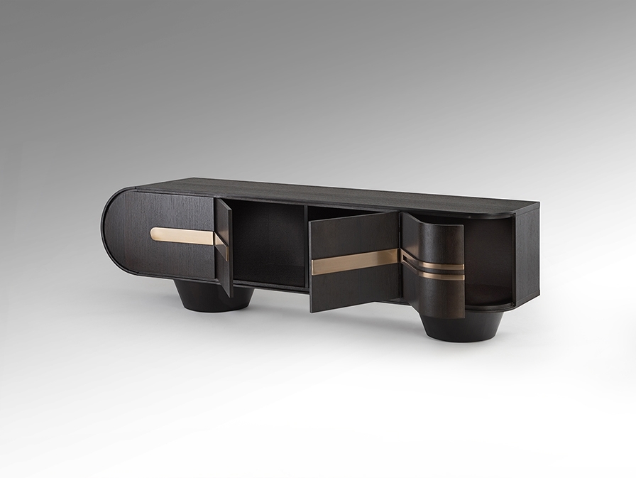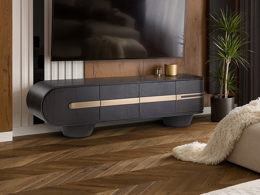 4-дверная тумба под телевизор изготовлена из МДФ цвета темного дуба, с фурнитурой и металлическими деталями из нержавеющей стали с покрытием розового золота.