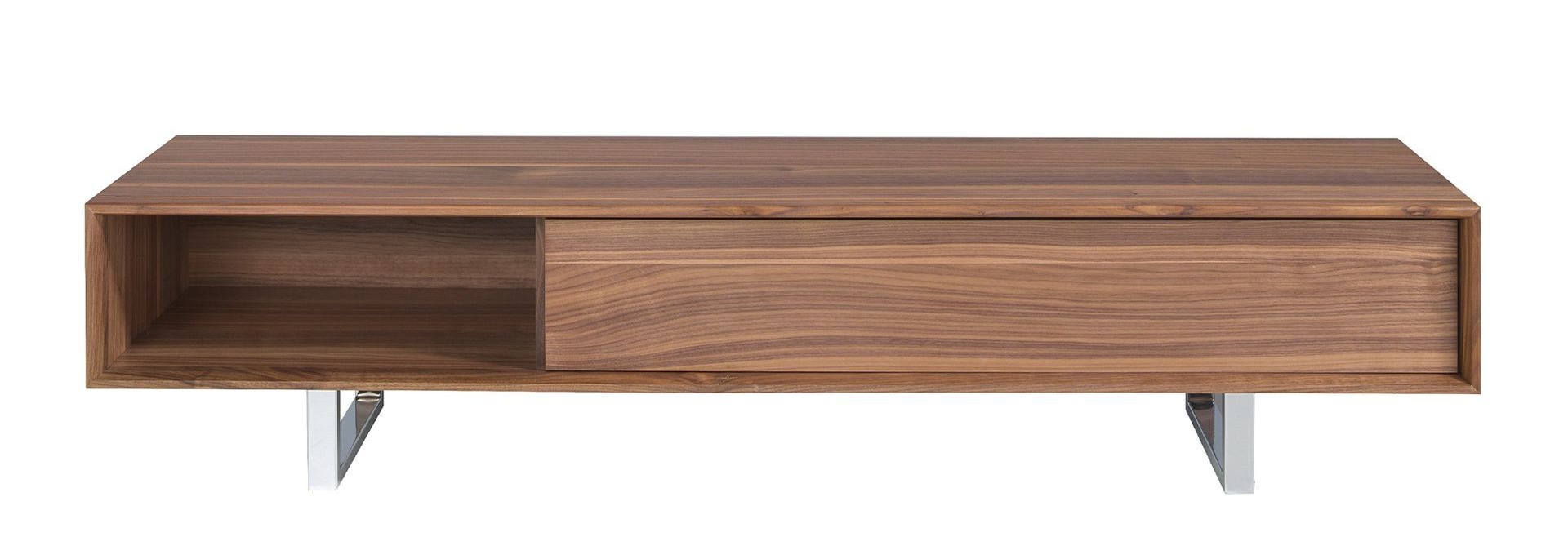Тумба конструкционно состоит из двух ножек, одного выдвижного ящика и каркаса формы вытянутого прямоугольника. Широкий выдвижной ящик длиной 120 см — это вместительное хранилище для дисков, игровых приставок и прочих девайсов, которые обычно загромождают пространство возле телевизора. Ящик оснащен прочными металлическими направляющими и доводчиком на открывание и закрывание. Открытая полка рядом — отличное место для установки модема, хранения пультов ДУ. Материал изготовления — МДФ и шпон орехового дерева. Он отличается красивым природным орнаментом и мягким коричневым цветом. Данная порода прочная и долговечная. Опоры выполнены из хромированной стали. Они имеют рамочную конструкцию, благодаря чему тумба уверенно будет стоять на поверхности с любым напольным покрытием. Размеры тумбы: длина — 180 см, высота — 39 см, глубина — 44 см. Вес составляет 42 кг. Доставка осуществляется в разобранном виде. Для самостоятельной сборки предусмотрен крепеж и инструкция.