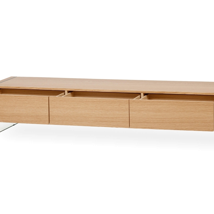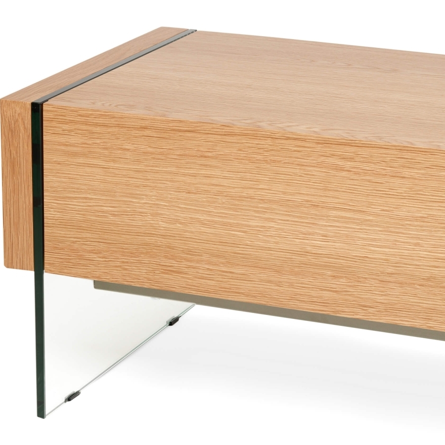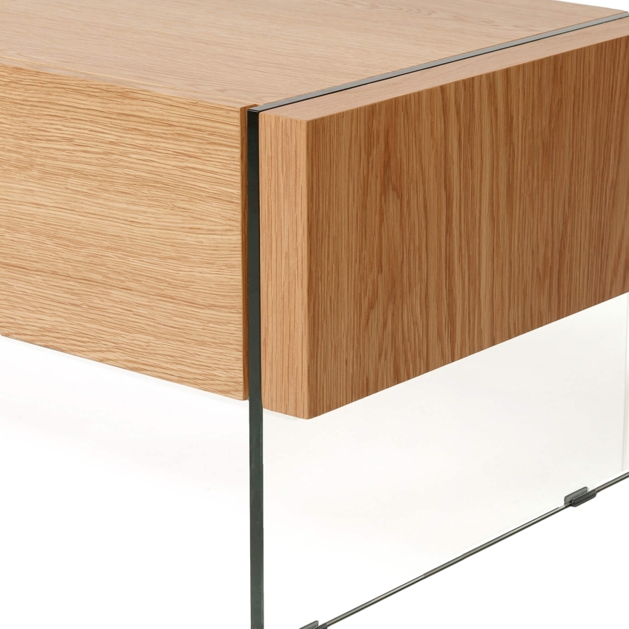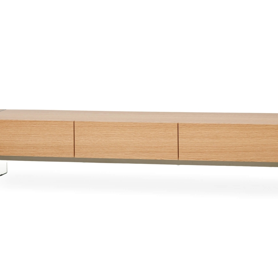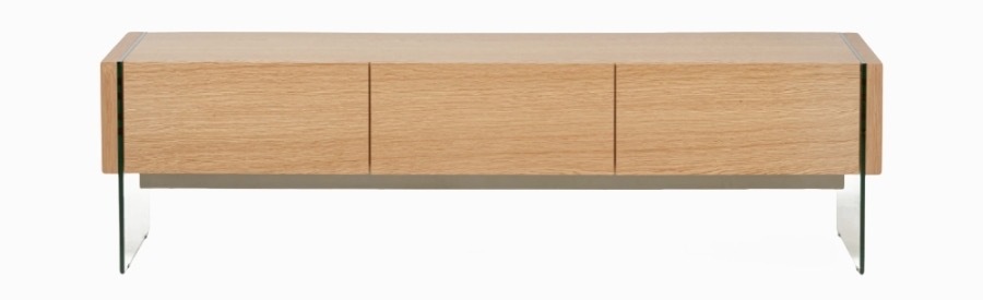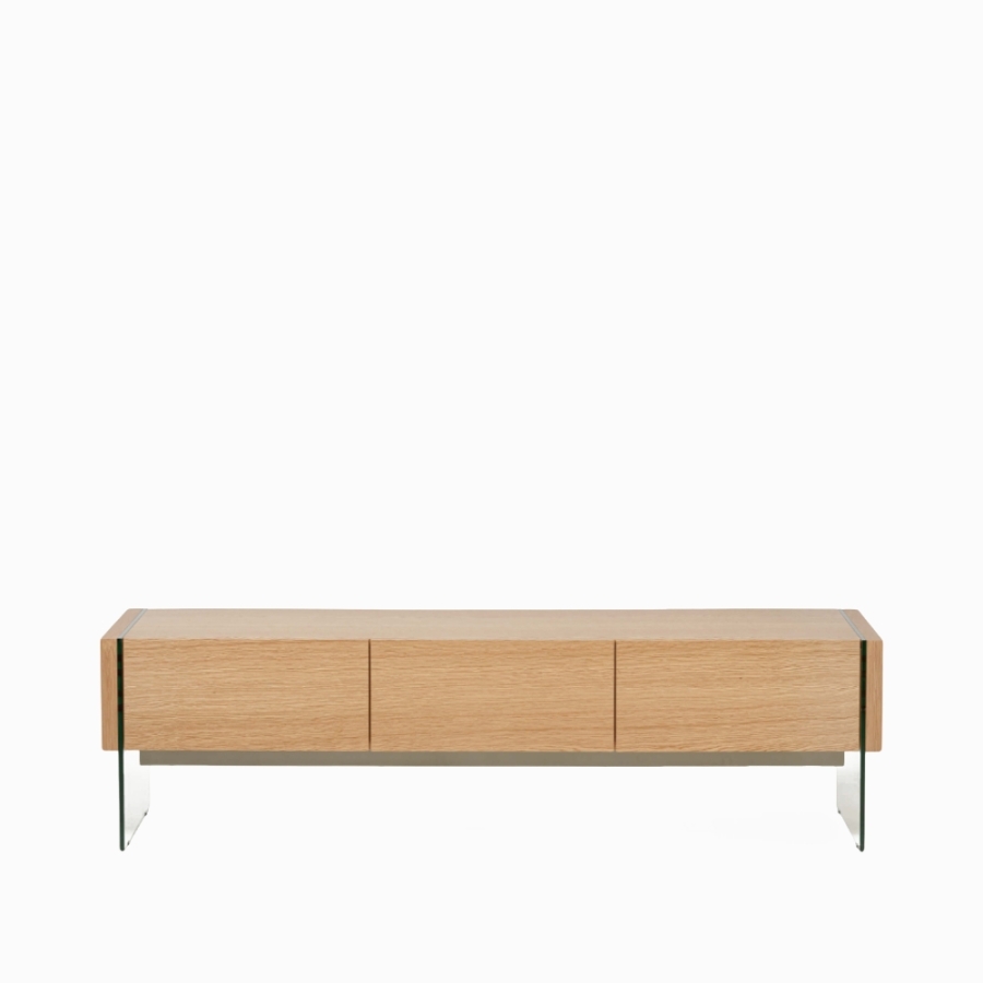 Предоставляет достаточно места для размещения телевизора, аудиосистемы, декоративных элементов и других вещей. Стеклянные ножки добавляют легкости и изящества. Сочетание дуба и стекла придает тумбе изысканность и уникальность.