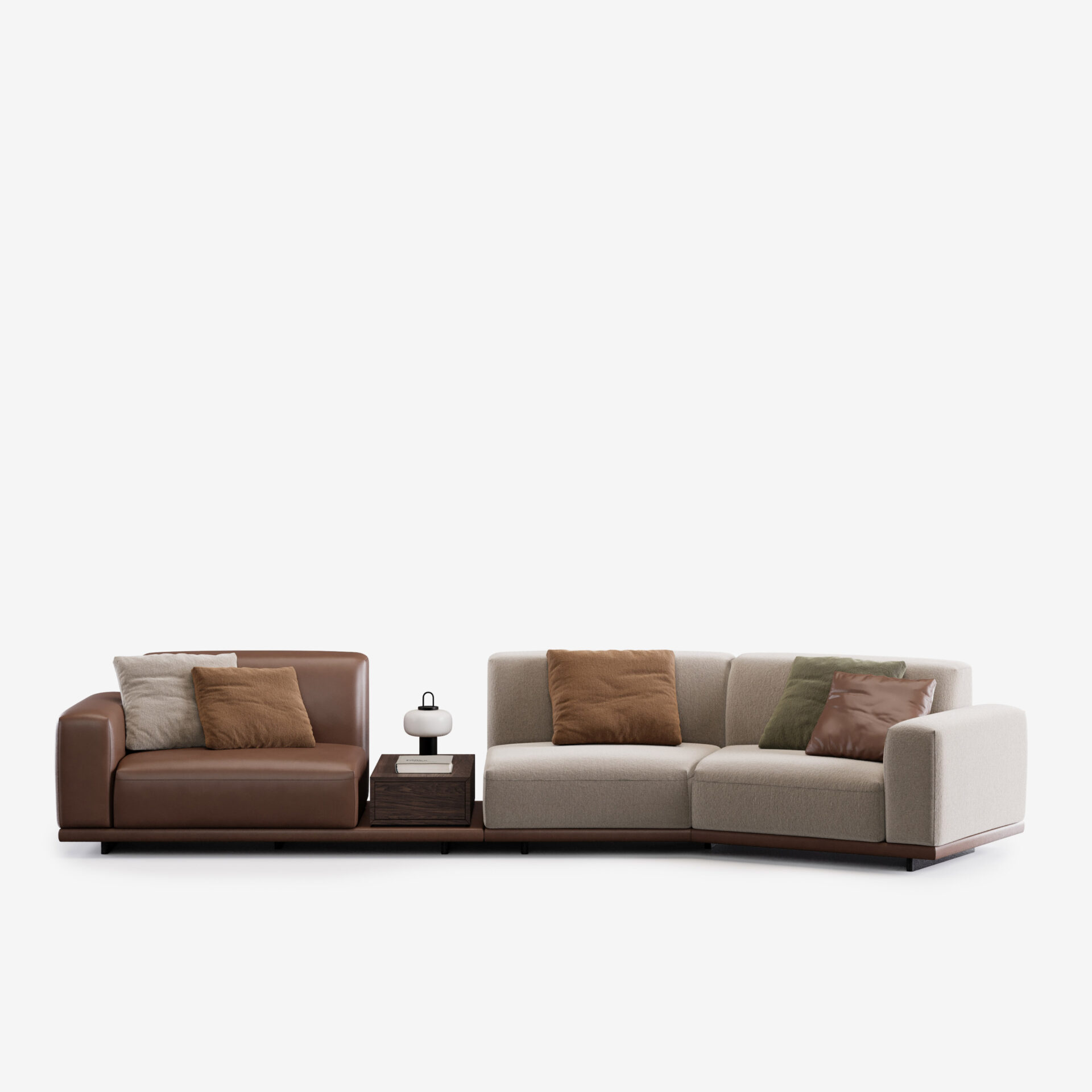 Все модули самостоятельны — их можно комбинировать или использовать по отдельности, создавая именно ту среду, которая вам нужна. Коллекцию дополняют кресла, повторяющие ее пластику, и многофункциональные пуфы-столики с отделкой из шпона дуба. Диван можно персонализировать практичными элементами: подлокотниками, подставками, боковыми столиками и ящиками для хранения, которые легко объединяются с основными модулями.