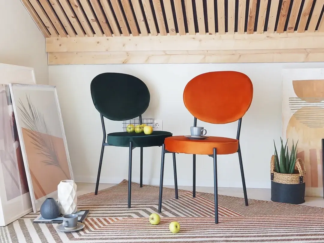 Мягкий кухонный стул Noemi подойдёт тем, кто ценит комфорт во всех его проявлениях, в том числе и за обеденным столом. Удобная конструкция стула позволяет разместиться на нём и ребёнку, и взрослому. Каркас и ножки металлические черного цвета, выдерживают большую нагрузку. Наличие подпятников предохраняющих от царапания пола. Спинка даёт возможность сохранить удобное положение тела во время обеда. Сиденье и спинка обиты прочным и ярким велюром, в качестве наполнителя используется плотный и упругий поролон. Модель представлена в зелёном, оранжевом, бирюзовом, желтом, коричневом и белом вариантах.