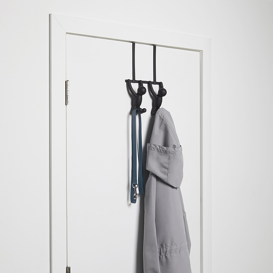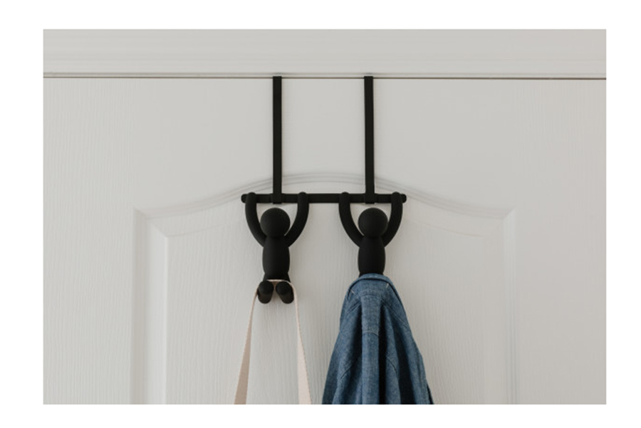 Надверная вешалка Buddy – оригинальное приспособление для хранения одежды. Авторами дизайна выступили Alan Wisniewski и Wesley Chau. Основание выполнено из сверхпрочного АБС-пластика, устойчивого к износу и воздействию влаги. Конструкция оснащена надежной панелью для удобного крепления к дверям без вкручивания дюбелей или использования клея. Крючки в виде забавных человечков способны выдерживать нагрузку до 2,3 кг. Материалы: АБС-пластик, сталь, этиленвинилацетат. Размеры: 21,6х11х30 см. Пыль и загрязнения с поверхностей можно удалять при помощи мягкого влажного материала. После очищения вешалку рекомендуется протереть сухой салфеткой.