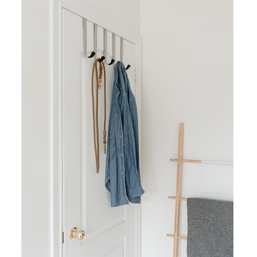 Надверная вешалка Schnook идеально дополнит интерьер кухни, прихожей или ванной комнаты. Автором идеи создания многофункциональной вешалки для дома стал талантливый дизайнер Thea Yuzyk. Аксессуар выполнен из штампованного металла высокого качества. Благодаря никелевому покрытию изделие не поддается коррозии и сохраняет привлекательный вид на протяжении всего срока эксплуатации. Изделие легко крепится к дверям без использования клея и дюбелей. Специальная накладка препятствует скольжению вешалки по поверхности. Аксессуар снабжен пятью крючками с резиновыми наконечниками, защищающими одежду от повреждений. Материалы: сталь, полипропилен.