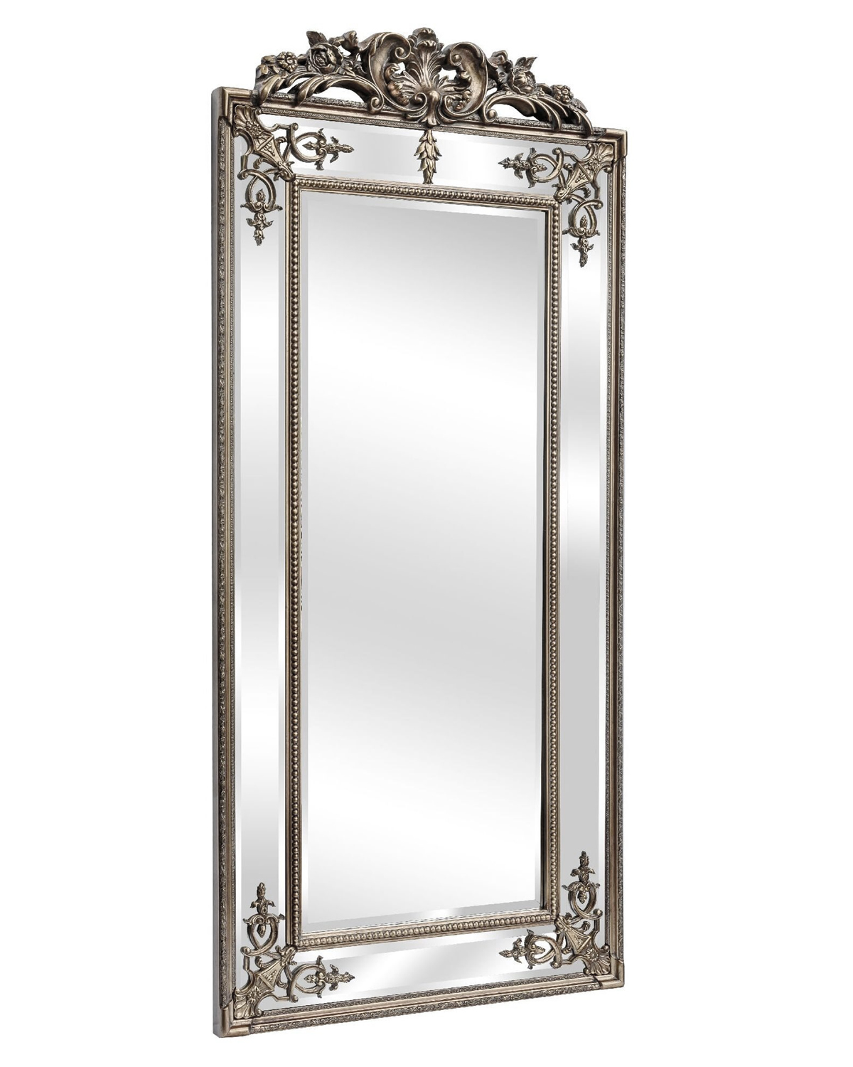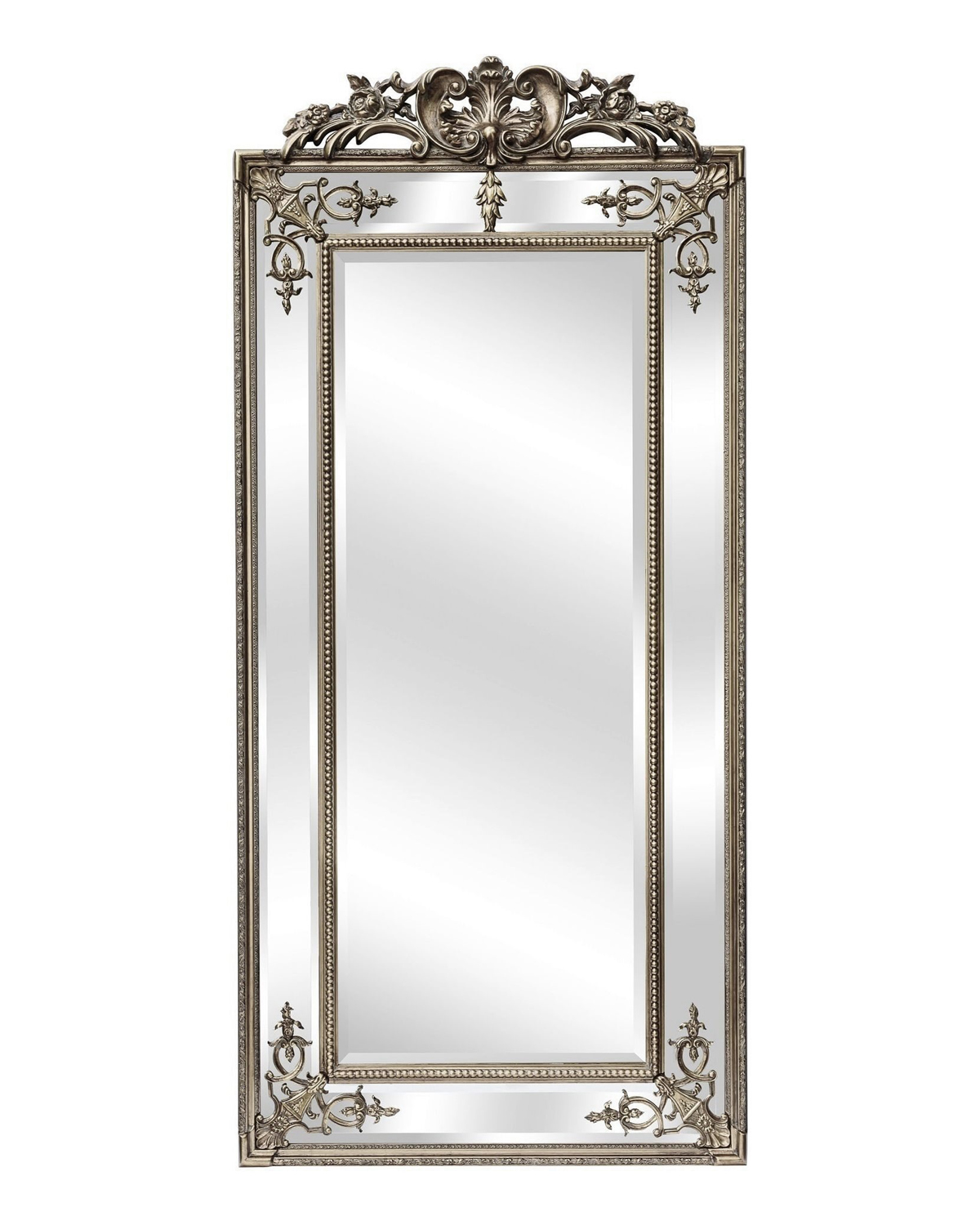 Это высокое, изящное и витиеватое напольное зеркало в раме цвета античное серебро имеет четыре панели с фацетом и филигранным узором. Внутреннее зеркало окантовано орнаментом в виде бус. Верхушка украшена цветочным узором, добавляющим пышность к общему виду. Прекрасное декор для интерьера в классическом стиле.