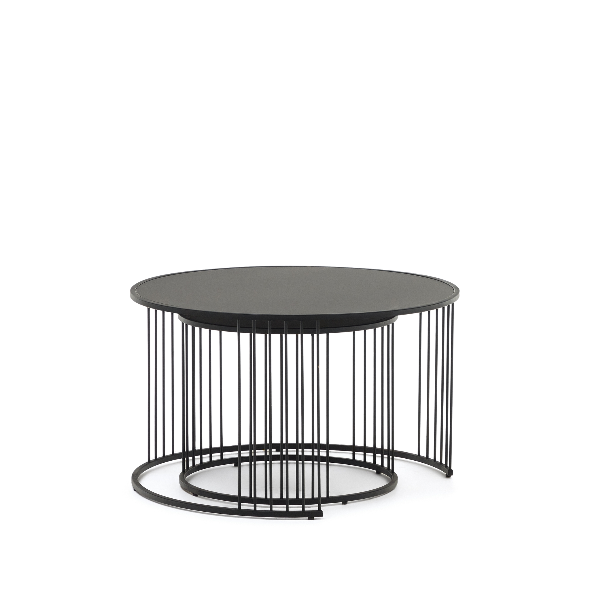 Комплект приставных столиков Hadar от фабрики La Forma (ex Julia Grup) – промышленный дизайн с двойной пользой. Столики Hadar – прекрасная возможность разнообразить обстановку с пользой. Промышленный минимализм, как основа в дизайне изделий, добавит пространству стиль и современный городской шик. А металл, как материал изготовления, будет вам гарантией в долговечности изделий. Встречайте свою промышленную эстетику! Столики круглые, состоят из металлического каркаса и стеклянной столешницы. Столешница имеет толщину 5 см. Она матового черного цвета, противоударная. Края обработаны от порезов. Столешница помещена в обруч высотой 1,4 см. Основание сделано из стали с черным матовым покрытием. Краска защищает металл от коррозии, иных негативных внешних воздействий. Стержни, соединяющие обруч-опору со столешницей, имеют диаметр 6 мм. Для устойчивости, на нижнем обруче есть специальные накладки. Размеры: диаметр – 75/50 см, высота – 45/40 см. Вес изделий – 13,5 кг. Столики предназначены только для эксплуатации в помещении