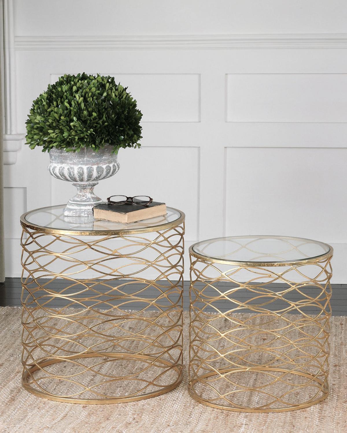 Комплект из двух приставных столиков с круглой столешницей и металлическим основанием в виде волнообразной сетки золотого цвета. Размер S: _ 42,5 см. x 42,5 см. Размер M: _ 50 см. x 52,5 см.