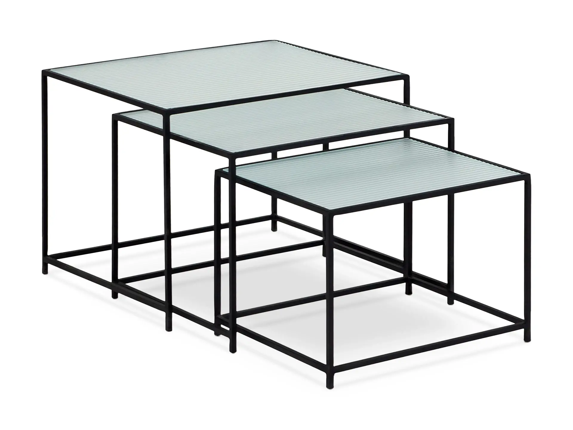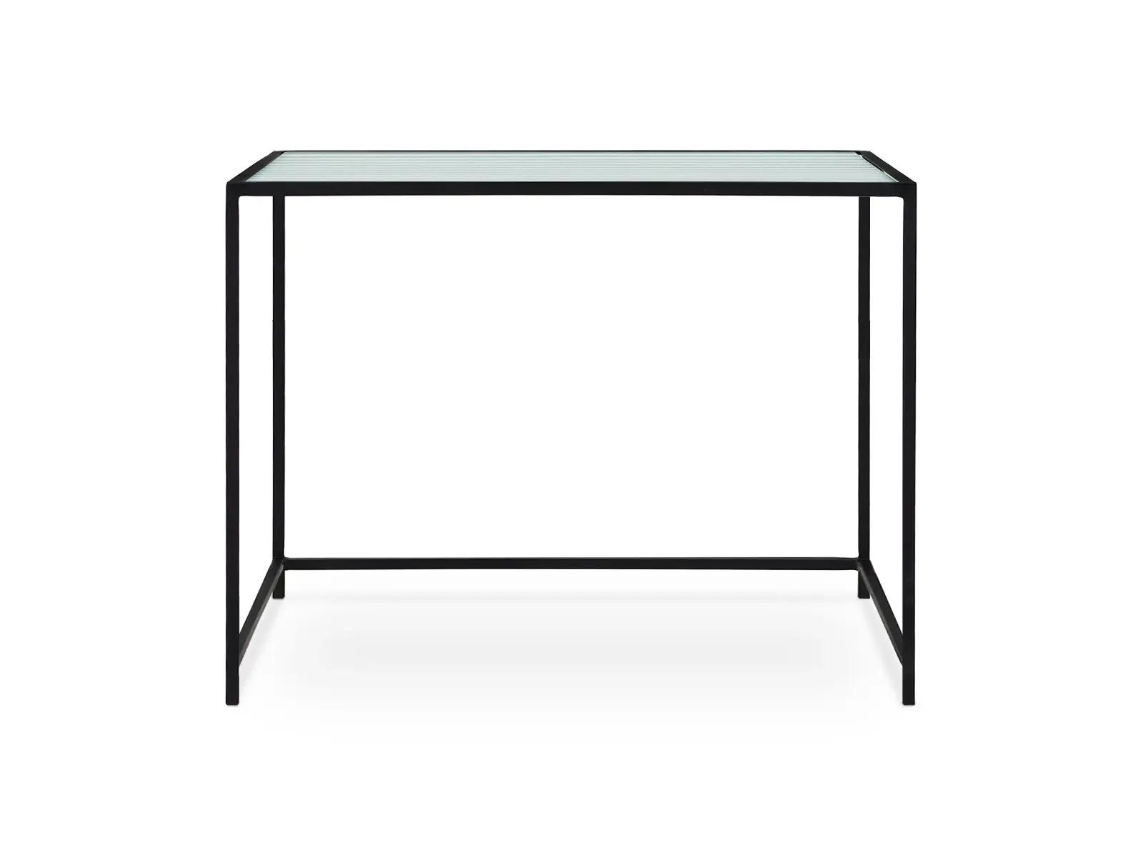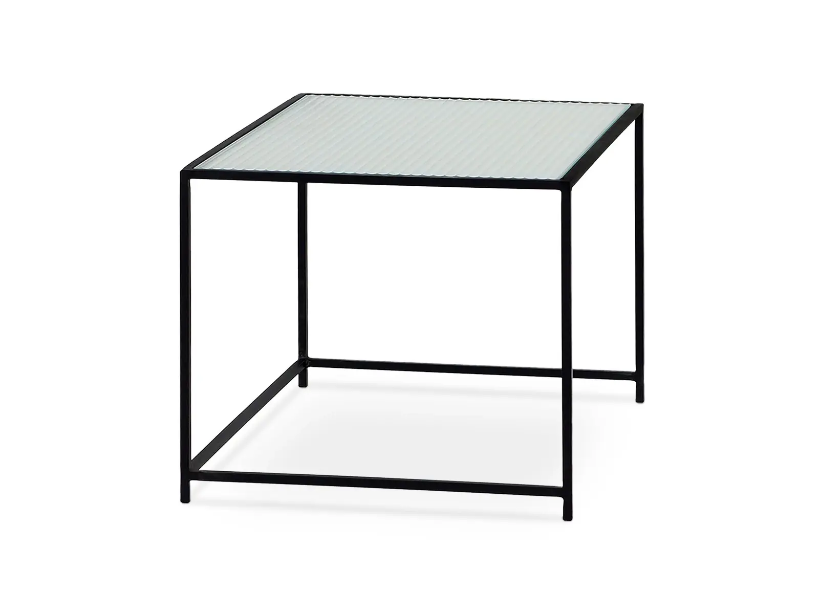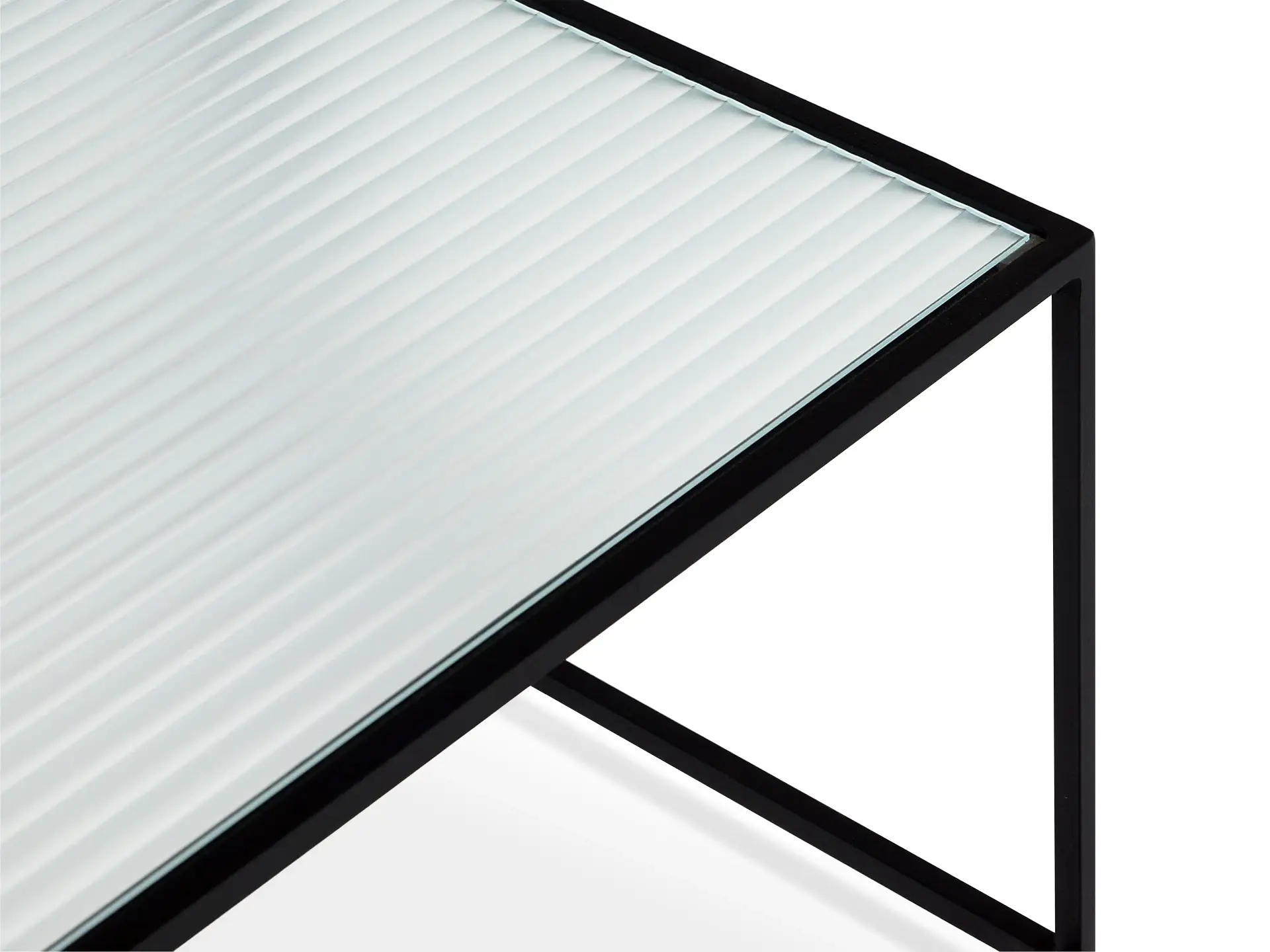 Каркас металлический с черным матовым покрытием. Стеклянная столешница выполнена из прозрачного рифленого стекла. Столешница укладывается сверху на резиновые демпферы, расположенные в углах каркаса.