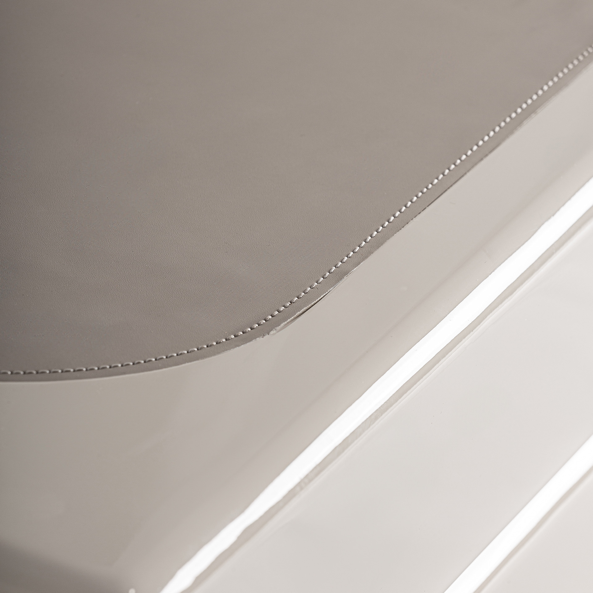 Журнальный столик из МДФ в сочетании с бежевым полиуретаном коричневого цвета. Ширина: 140 см, Глубина: 35 см, Высота: 29 см