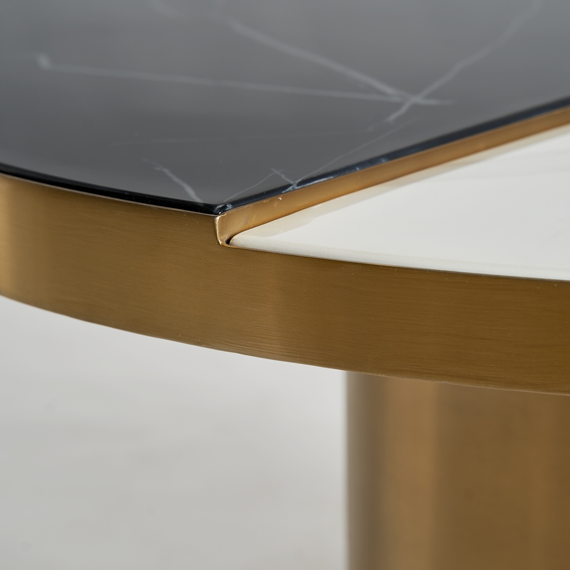 Контраст стали и керамики определяет индивидуальность журнального столика Grein. Его чёрно-бело-золотая отделка придаёт ему визуальную динамичность и изысканность. Изделие в стиле ар-деко, преображающее любое пространство графическим штрихом. Дизайн VICAL. Ширина: 90 см, Глубина: 90 см, Высота: 42 см