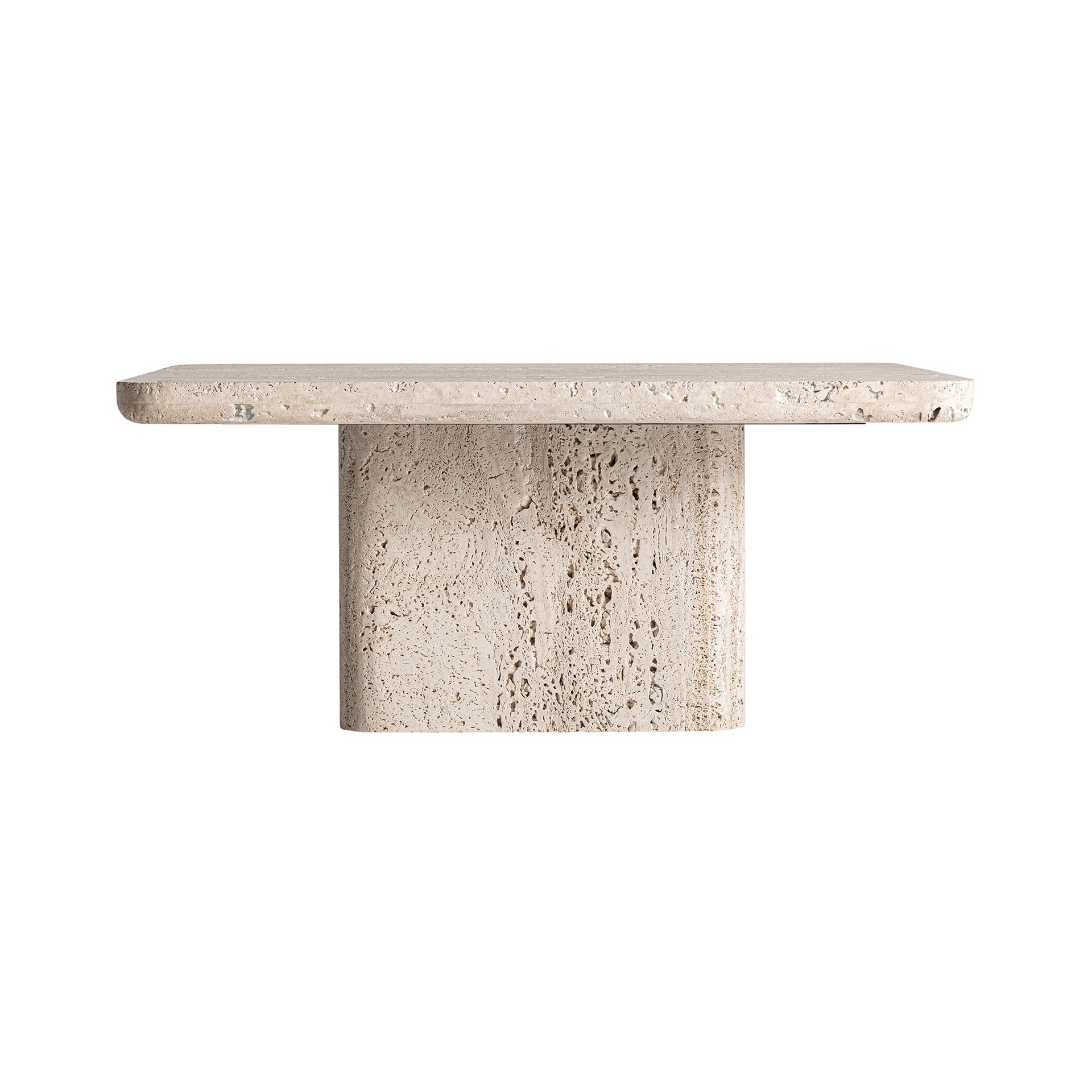 Журнальный столик Theuville, бежевый, в стиле арт-деко. Изготовлен из травертина. Столик изготовлен из натуральных материалов, поэтому каждый из них будет эксклюзивным, со своими уникальными оттенками и текстурами. Пористость и неоднородность материала не считаются браком.