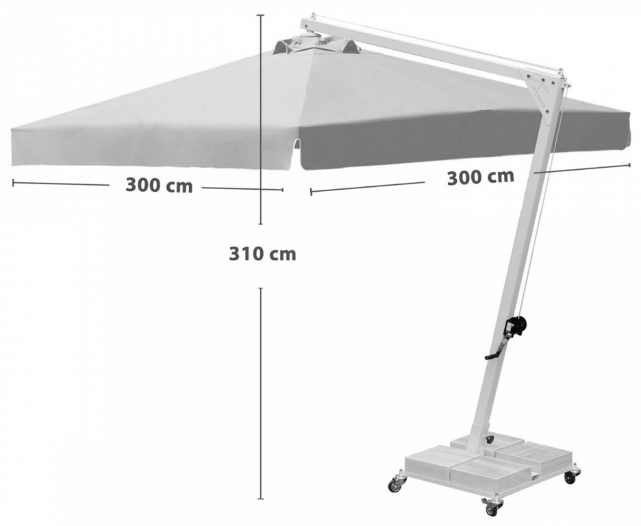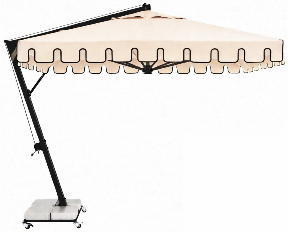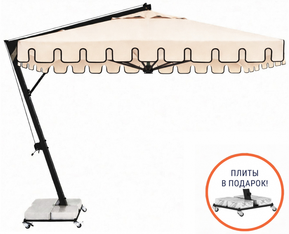 Цена действительна при заказе от 8 шт.! Banana - профессиональный зонт с боковой опорой из алюминия, что обеспечивает его высокую устойчивость. Он защитит от ярких солнечных лучей и создаст приятную затененную атмосферу в частных садах, открытых летних площадках кафе, баров и ресторанов, зоны возле бассейна. Наличие боковой опоры зонта гарантирует, что тень зонта используется более эффективно, чем с зонтами с центральной стойкой. Зонты Banana изготавливаются разных размеров и форм с учетом различных областей применения и размеров затеняемой площади. Зонты квадратной формы можно поставить в ряд, чтобы полностью закрыть зону затенения. Это предлагает вам очень гибкое и экономичное решение по сравнению с перголой или другими типами навесов. Хотя это корпоративный продукт, предпочитаемый кафе, ресторанами и отелями, однако, зонт Banana также украшает многие сады и террасы. Это очень востребованная модель по таким причинам, как практичность и эргономика, возможность открывать и закрывать, не мешая тем, кто находится под зонтом, а также простота транспортировки и перемещения благодаря утяжелительной базе с колесным тормозом. Особенности: Боковая опора сечением 70х70 мм и толщиной стенки 2.5 мм выполнена из окрашенного алюминия со специальной термообработкой, которая повышает прочность и коррозионную стойкость зонта. 8 алюминиевых спиц 20х30 мм и толщиной стенки 2 мм. Детали выполнены из цельного пластика. Высота до кромки открытого купола: 2200 мм. В комплект входит металлическая база на колесах, размер: 790х710х60 мм, с мраморными утяжелителями, размер: 340х340х120 мм. Вес базы 24 кг, каждый утяжелитель 34 кг. Общий вес базы 160 кг. Размер упаковки: 850х750х100 мм. Механизм открывания и закрывания зонта обеспечивается поворотом лебедки, соединенной с механической системой передач на боковой части корпуса. Эта механическая система передач также имеет предохранительный замок для повышения безопасности. Даже если кронштейн зонта находится в разблокированном состоянии, он не повернется назад, и зонт не закроется. Как только вы открываете этот замок, кронштейн зонта возвращается на один уровень, позволяя закрыть зонт. Благодаря этому механизму, не требующему дополнительной силы, зонт легко открывается и закрывается. Купол выполнен из акрила 2926 (natural) с черным кантом. Функция вращения на 360º оплачивается дополнительно. Открыть инструкцию поэксплуатации уличных зонтов. Обращаем Ваше внимание! Плиты идут в подарок к зонту! В норме допускаются незначительные сколы и царапины мрамора по периметру, т.к. мрамор - это природный материал. На плиты рекламации не принимаются, Вы имеете право безвозмездно отказаться от них. Цена на сайте указана за модель с каркасом черного цвета и куполом из акрила с воланом с кантом. Цены на другие модели Вы можете уточнить у менеджеров.