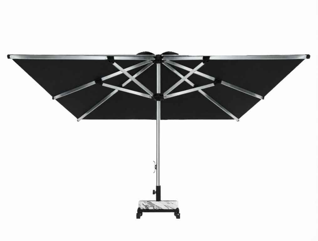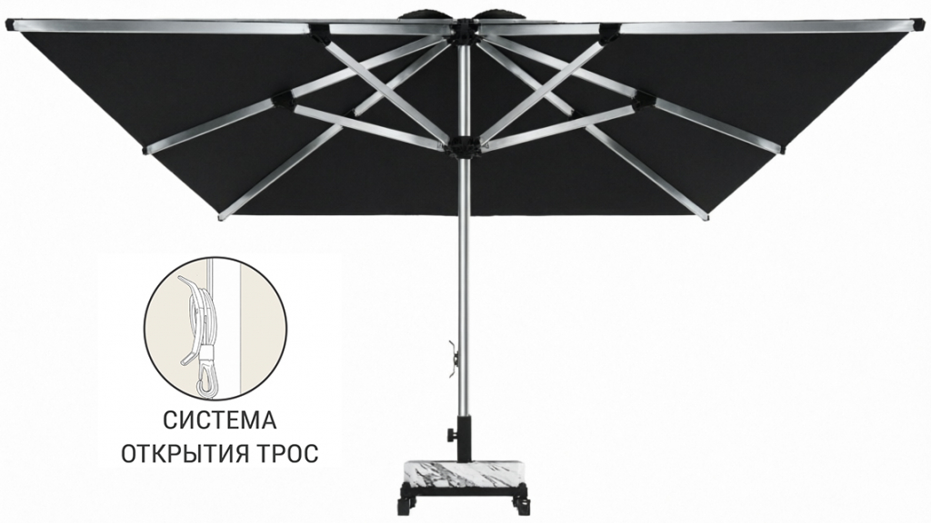 Avocado — профессиональный зонт с центральной опорой из алюминия, обеспечивающий высокую устойчивость и надежную защиту от солнца. Квадратный купол 3х3 метра создает идеальную тень для обеденных зон, столов и террас. Модель более чем удовлетворит ваши потребности благодаря доступности, эстетике, прочности и долговечности. Система веревочного полиспаста позволяет открывать зонт простым потягиванием за веревку с фиксацией на крючке. Серебристый каркас и купол из премиального акрила глубокого черного цвета создают выразительный, современный контраст. Высота зонта 2800 мм обеспечивает комфортное пространство даже для высоких людей. Утяжелительная база 70 кг приобретается отдельно.
