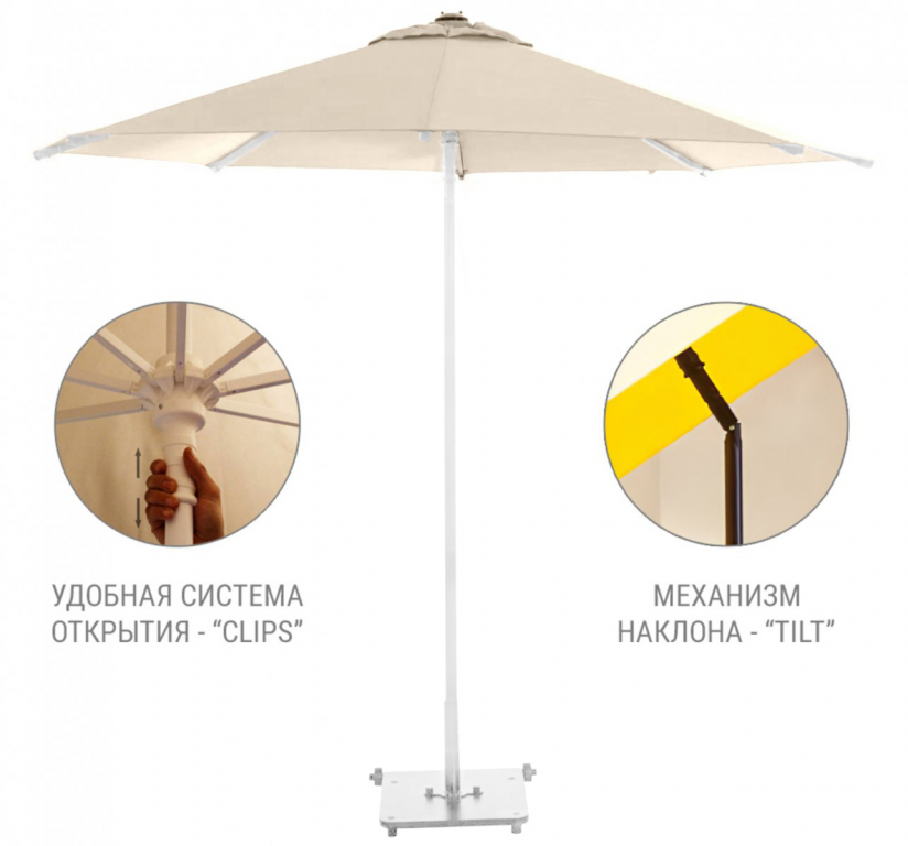 Kiwi Clips- профессиональный зонт с центральной опорой из алюминия, что обеспечивает высокую устойчивость модели. Он защитит от ярких солнечных лучей и создаст приятную затененную атмосферу в частных садах, открытых летних площадках кафе, баров и ресторанов, зоны возле бассейна. Это больше, чем зонт, с его эстетичным и стильным внешним видом, простотой открытия и закрытия, долговечностью и дополнительными функциями, такими как журнальный столик и пепельница. Система зажимов, используемая в зонте Kiwi Clips, работает по логике, аналогичной ручным зонтам. В отличие от ручных зонтов, сила, используемая для открывания и закрывания, исходит от натяжения ткани зонта. Нажимая пластиковый корпус вверх, зонт открывается. После прохождения определенного места гибкость ткани берет на себя силу, приложенную к пластиковому корпусу, и зонт остается полностью раскрытым и зафиксированным. Если опустить пластиковый корпус, и зонт закроется. Особенности: Открывается легким движением руки, с плавным ходом и надежной фиксацией. Имеет наклонный механизм, благодаря которому купол можно расположить под нужным углом. Центральная опора Ø35 мм, столщинойметалла 2 мм, выполнена из алюминия.Алюминий окрашен и прошел специальную термообработку, которая повышаетпрочность и коррозионную стойкость зонта. 8 спиц 12х18,с толщиной металла 1 мм, выполнены из алюминия. Высота зонта2100 мм, в открытом виде до спиц - 1800 мм. Детали выполнены из цельного пластика. Возможно выполнение купола из тканей: бежевый полиэстер, олефин, акрил. Цвет купола из ткани олефин можно выбрать из представленной палитры. Покрытие опоры и спиц можно выбрать из представленной палитры. Покрытие черного цвета +10% к стоимости изделия. Дополнительно можно приобрести утяжелительнуюбазувесом 50 кг. Цена на сайте указана за модель с куполом из бежевого полиэстера. Цены на другие модели Вы можете уточнить у менеджеров.