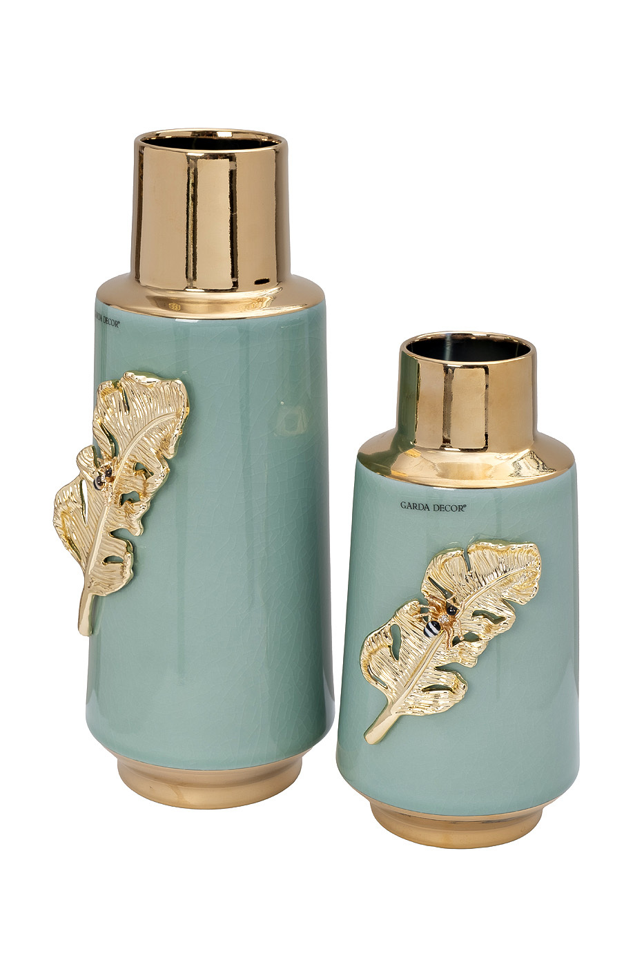 Оригинальная ваза, украшенная золотыми элементами, эффектно дополнит современный или классический дизайн интерьера. Изделие изящно сочетает цветовые решения. В нем нежный бирюзовый оттенок объединился с благородным золотым цветом, создавая декоративное украшение для истинных ценителей прекрасного. Золотое перо выполнено с максимальной детализацией, что делает вазу запоминающейся. Золотая деталь визуально продолжает изящное горлышко золотого оттенка. Вазу можно поставить в гостиной, спальне или в столовой зоне, чтобы придать помещению стиля и престижа.