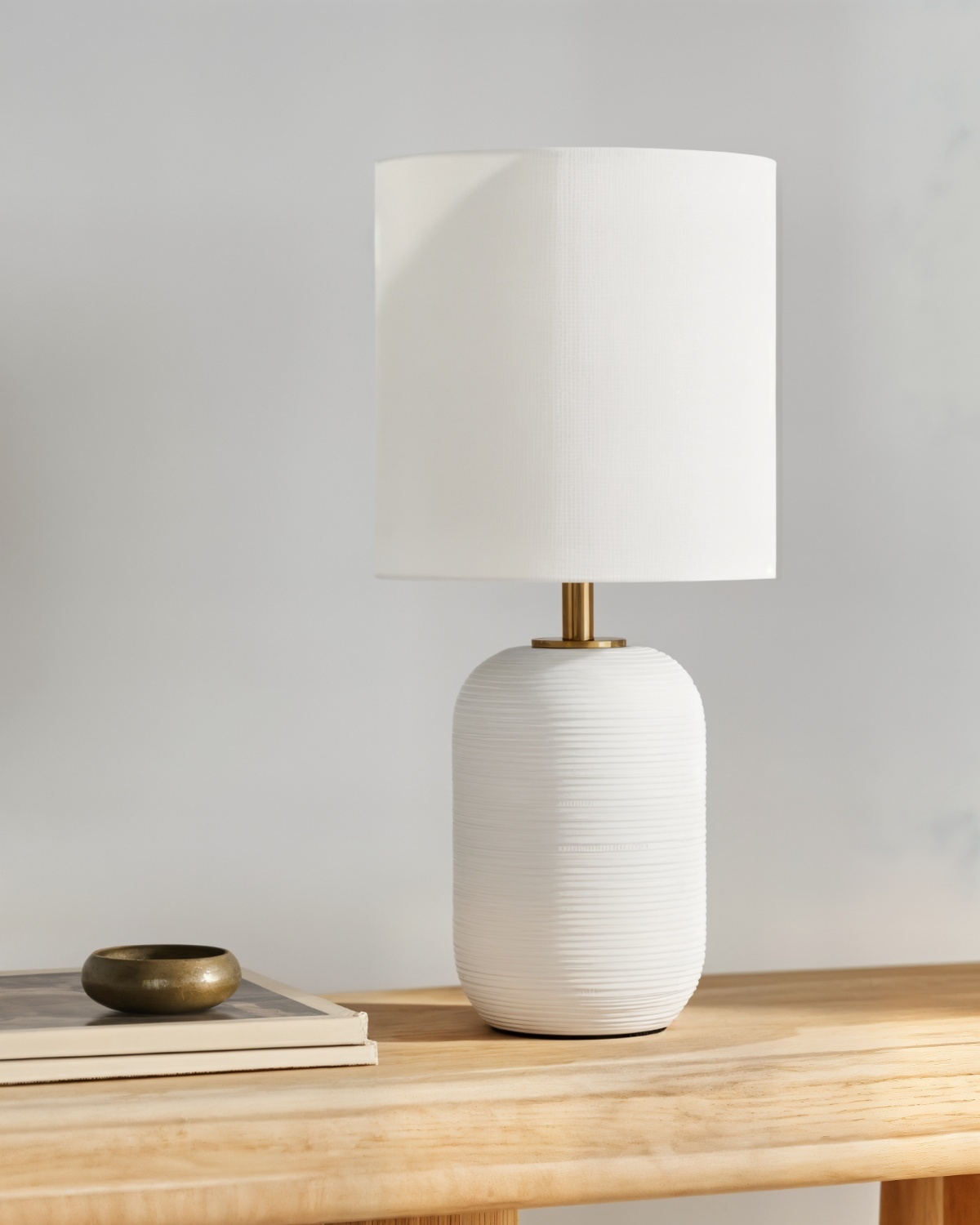 Белая настольная лампа "Гретта" - это элегантный акцент для современного интерьера. Основание выполнено из керамики с матовой рельефной поверхностью, которая придаёт изделию выразительную фактуру и глубину цвета. Лаконичный цилиндрический абажур из плотной белой ткани мягко рассеивает свет, создавая уютную атмосферу. Благодаря сочетанию белого и латунных деталей лампа "Гретта" гармонично впишется как в минималистичные, так и в классические интерьеры. Идеальна для прикроватной тумбы, консоли или рабочего стола.