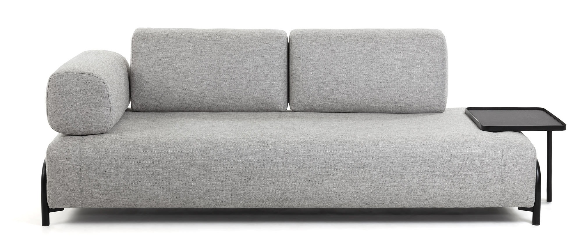 Диван Compo от La Forma с возможностью замены подлокотников на подносы. Обивка из 100% полиэстера (фактура «рубчик», 310 г/м²). Каркас из ДСП сосны, МДФ, акриловых волокон. Наполнитель: спинка/подлокотники — ППУ 20 кг/м³, сиденье — ППУ 30 кг/м³. Металлические опоры (трубчатые, чёрные). Чехлы съёмные. В комплекте поднос.
