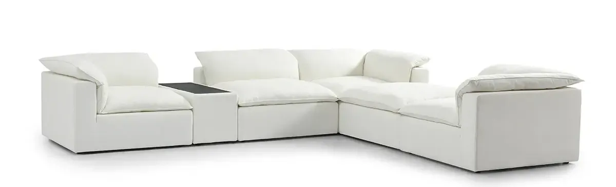 Диван Rivoli в стиле «новая классика» с элементами софт-минимализма. Чистые линии, гармоничные пропорции. Состоит из модулей, соединяющихся зацепами типа «крокодил». Обивка — ткань (80% вискоза, 20% лен). Наполнитель подушек — пух/перо (лицевые чехлы съёмные, на молниях). Ножки — пластик. В комплекте приставной столик со столешницей из МДФ со шпоном.