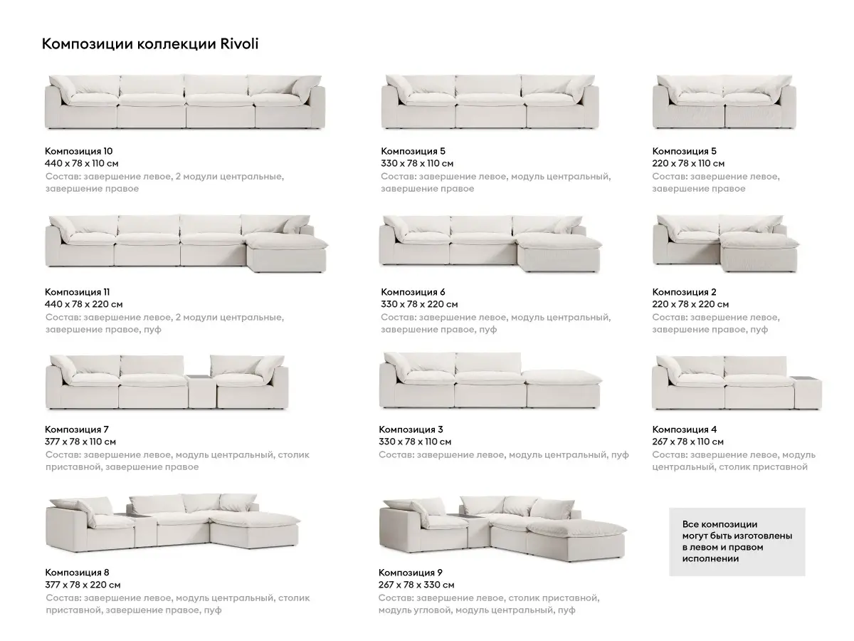 Диван Rivoli — новая классика, выраженная в чистых линиях, гармонии элементов и высоком качестве материалов. В основе дизайна — софт-минимализм с гибкой универсальностью и выверенным сочетанием пропорций. Деликатное взаимодействие четких линий каркаса с мягкими подушками сиденья и спинки обеспечивает сбалансированный внешний вид, транслирующий непринужденную статусность, эффект «дорогой простоты». Поэтому диван гармонично подружится как со спокойными аранжировками, так и с парадными стилизациями. Можно организовать привлекательное место для отдыха большой компанией в просторной гостиной или камерную локацию на компактной площади. Диван Rivoli — превосходный уровень комфорта и эстетики вашего интерьера! Диван «Rivoli» - модульный каркасный диван, состоящий из модулей, соединенных механизмом «крокодил». Каркас модулей монолитный, подлокотники не съемные. Каждый модуль комплектуется индивидуальной покровной подушкой, зафиксированной на карабины. Сидениедивана корпуса мягкое, дополнительную мягкость изделию придают верхние покровные мягкие перьевые подушки. Диван установлен на опору пластиковую со штырем – h 30мм. Лицевой чехол каркаса изделия - несъемный. Лицевой чехол покровных подушек- съемный, на молнии.