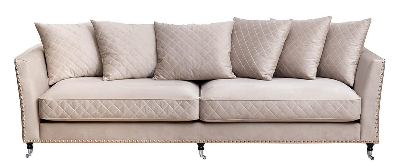 Элегантный диван с обивкой из роскошного микровелюра коллекции Garda Decor. Стеганые подушки сиденья и спинки из латексоподобного высокоэластичного полиуретана марки HR. Каркас из калиброванного деревянного бруса 1 категории, основание — фанера из натуральной березы и эластичные ремни. Отделка декоративными гвоздиками. В комплекте 6 подушек спинки 57×65 см с прострочкой на одной стороне. Колесные опоры — хром, гвозди хром большие.
