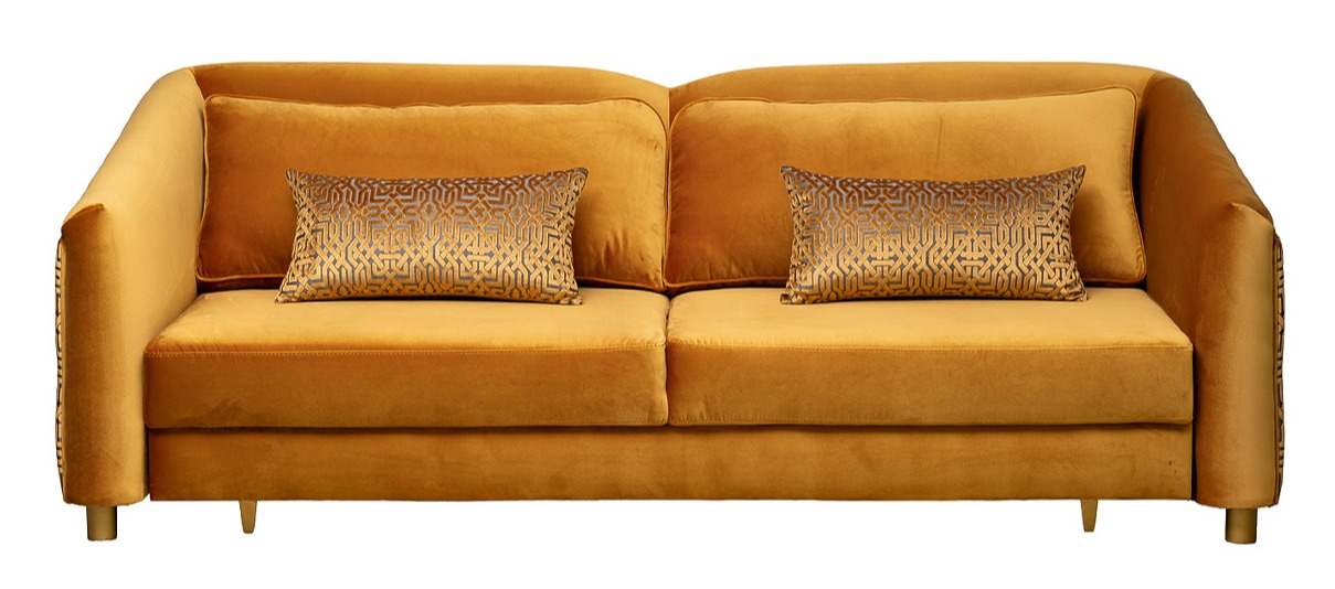 Трехместный раскладной диван Trevi яркого оранжевого цвета. Механизм трансформации «Пума» — легко превращается в полноценное спальное место (140×198 см). Каркас и ножки из массива дерева. Передние опоры — золото. Наполнение мягкое, подушки и подлокотники для комфортного сна.