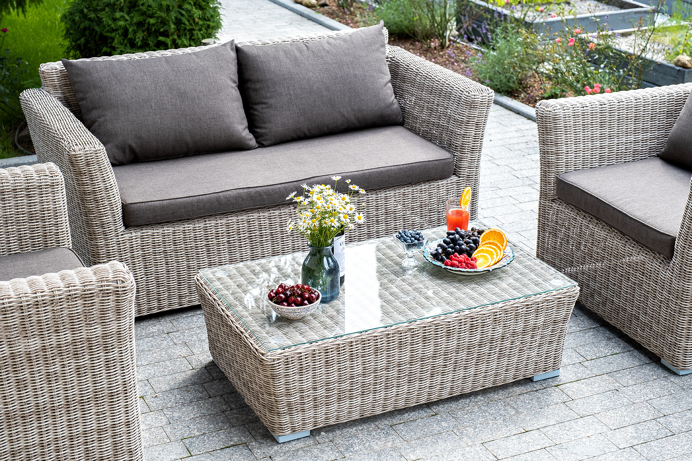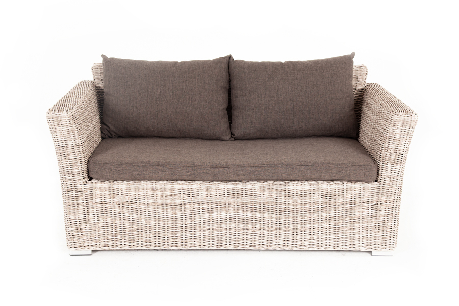 Диван «Капучино» подходит для удобного размещения двух персон. Он имеет алюминиевый каркас, который выдерживает высокие нагрузки. Размер модели – 1700×865×815 мм. Диван выполнен из искусственного ротанга натурального бежевого цвета с помощью ручного круглого плетения. Укомплектован двухместный диван подушками со съёмными чехлами. Они пошиты из прочного полиэстера. Материал обеспечивает защиту текстильным изделиям, которая усиливается за счет влагоотталкивающей пропитки ткани. Параметры дивана без подушек: Глубина сидения – 630 мм; Высота сидения – 370 мм; Высота спинки – 470 мм.