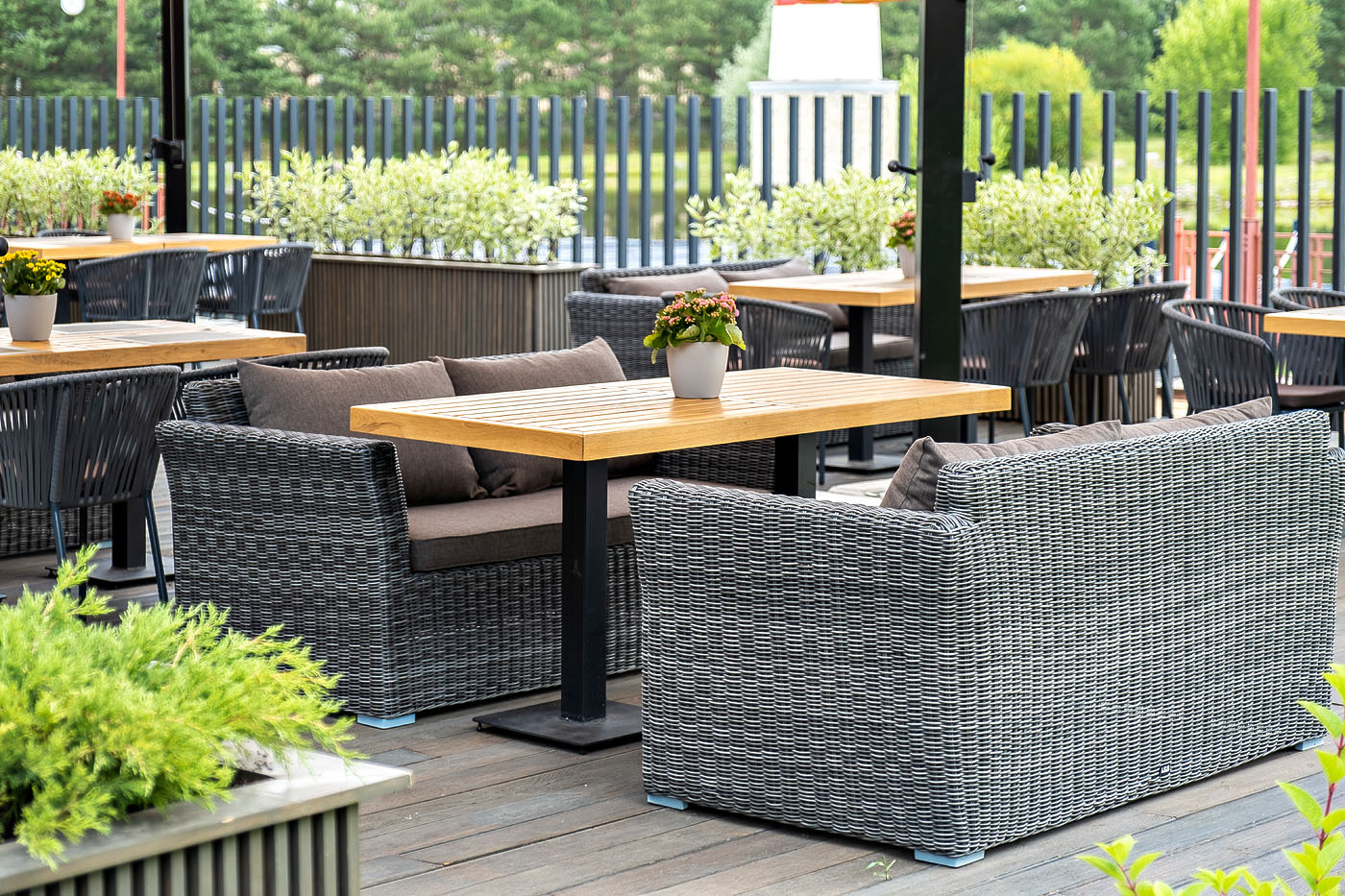 Диван «Капучино» двухместный с каркасом из прочного алюминия. Размер модели – 1700×865×815 мм. Диван выполнен из круглого искусственного ротанга графитового цвета, оплетенного вручную. Двухместный диван дополнен несколькими подушками со съёмными чехлами серого цвета. Они изготовлены из прочного полиэстера, плотность которого достигает 300гр/м2. Предусмотрена влагоотталкивающая пропитка ткани для защиты текстильных изделий от намокания. Параметры дивана без подушек: Глубина сидения – 630 мм; Высота сидения – 370 мм; Высота спинки – 470 мм.