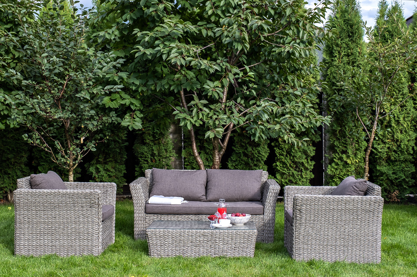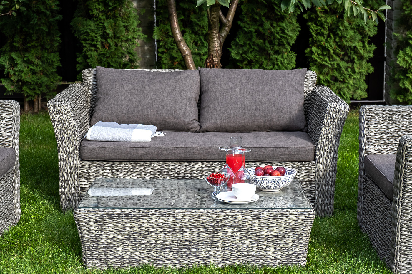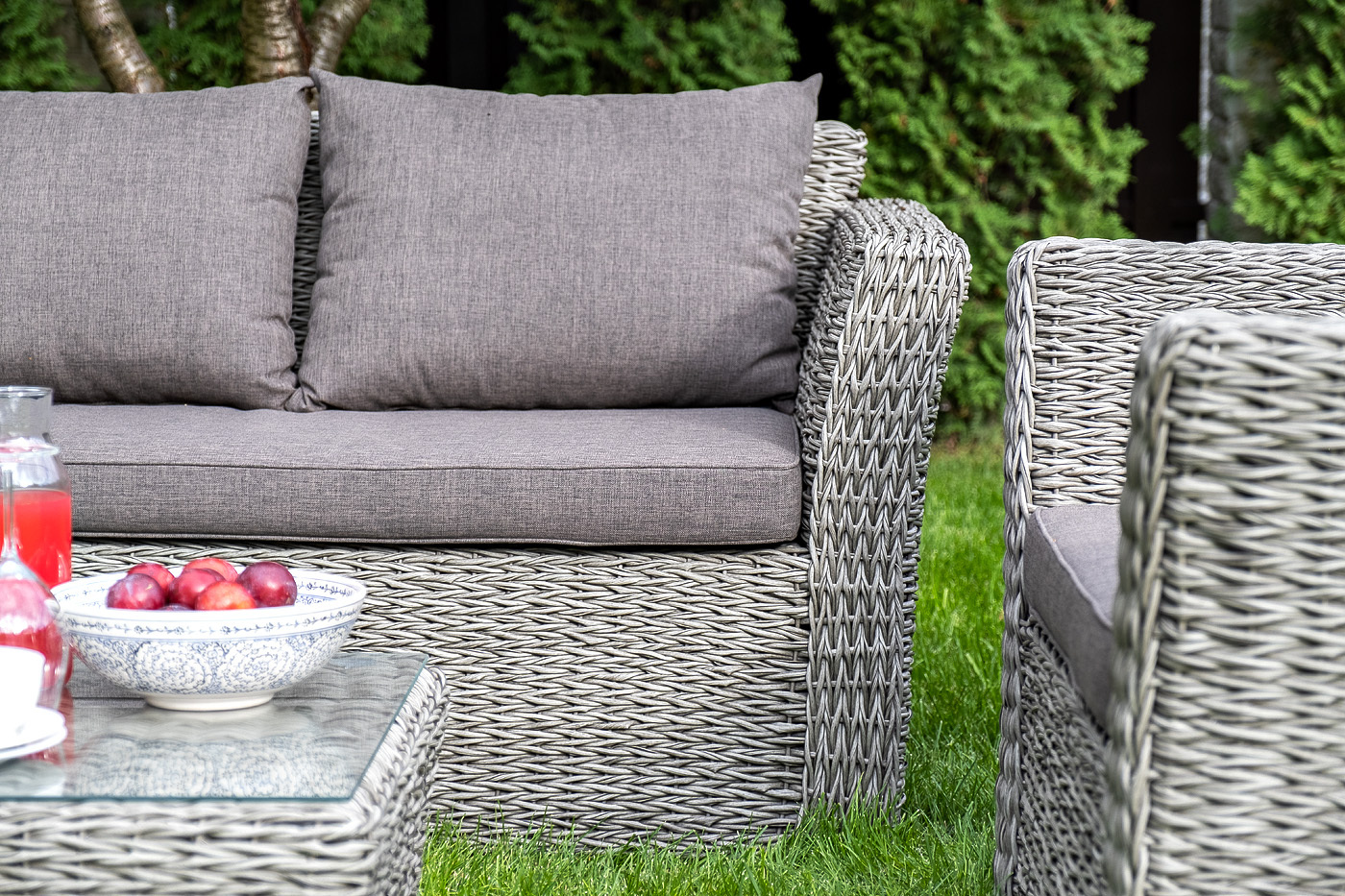 Диван «Капучино» двухместный с каркасом из прочного алюминия. Размер модели – 1700×865×815 мм. Диван выполнен из искусственного ротанга вида «гиацинт» серого цвета, оплетенного вручную. Двухместный диван дополнен несколькими подушками со съёмными чехлами серого цвета. Они изготовлены из прочного полиэстера, плотность которого достигает 300гр/м2. Предусмотрена влагоотталкивающая пропитка ткани для защиты текстильных изделий от намокания. Параметры дивана без подушек: Глубина сидения – 630 мм; Высота сидения – 370 мм; Высота спинки – 470 мм.