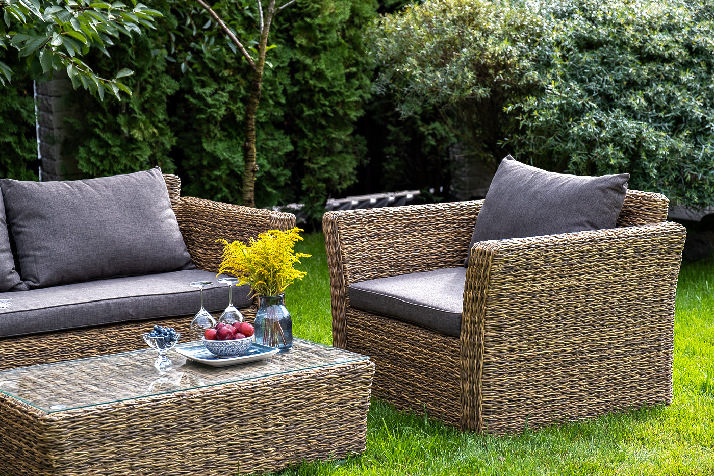 Кресло «Капучино» является практичным дополнением зоны отдыха, обустроенной мебелью из этой же серии. Размер модели – 1040×865×815 мм. Каркас изготовлен из прочного алюминия, оплетенного вручную искусственным ротангом вида «гиацинт» соломенного оттенка. Две подушки серого цвета представлены в комплекте с садовым креслом. Изделия пошиты из полиэстера плотностью 300гр/м2. В обязательном порядке материал обрабатывается влагоотталкивающей пропиткой для усиления своих защитных свойств. Параметры кресла без подушек: Глубина сидения – 630 мм; Высота сидения – 370 мм; Высота спинки – 470 мм.
